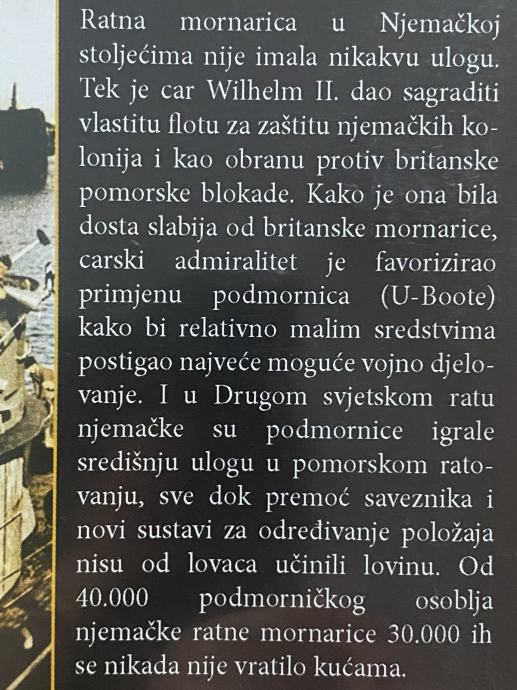 Ratna mornarica u Njemačkoj stoljećima nije imala nikakvu ulogu. Tek je car Wilhelm II. dao sagraditi vlastitu flotu za zaštitu njemačkih ko- lonija i kao obranu protiv britanske pomorske blokade. Kako je ona bila dosta slabija od britanske mornarice, carski admiralitet je favorizirao primjenu podmornica (U-Boote) kako bi relativno malim sredstvima postigao najveće moguće vojno djelo- vanje. I u Drugom svjetskom ratu njemačke su podmornice igrale središnju ulogu u pomorskom rato- vanju, sve dok premoć saveznika i novi sustavi za određivanje položaja nisu od lovaca učinili lovinu. Od 40.000 podmorničkog osoblja njemačke ratne mornarice 30.000 ih se nikada nije vratilo kućama.