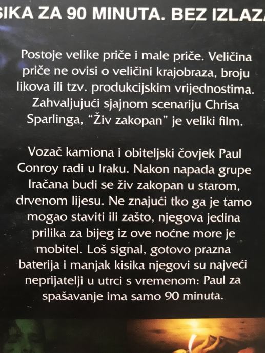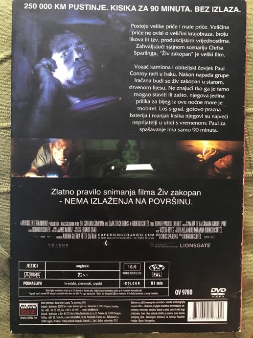 250 000 kvadratnih kilometara pustinje. Kisika za 90 minuta. Bez izlaza. Drugi dugometražni film španjolskog redatelja Rodriga Cortésa ("The Contestant") napeti je triler o mladom amerikancu kojeg otme skupina iračkih terorista te ga zatoči u lijes.