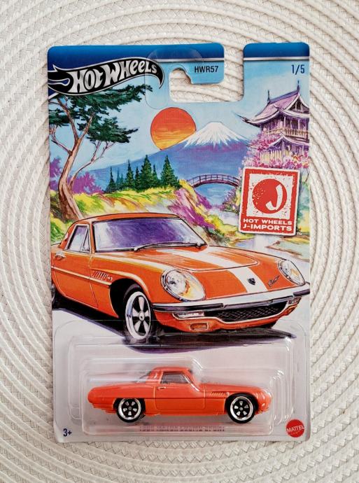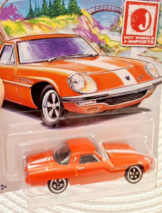 1968 MAZDA COSMO SPORT Prototip modela Cosmo Sport je predstavljen 1963. na Tokyo Motor Show ali će u masovnu proizvodnju tek 1967. Bio je to prvi automobil sa Wankelovim rotacijskim motorom što je bila tehnološka senzacija u automobilskoj industriji tog vremena (Mazda je kupila od NSU prava na proizvodnju motora). Prva serija je proizvedena u svega 350 komada, kojih je danas vrlo mali broj u svijetu. Druga serija se proizvodila od 1968. do 1971. ali zbog ručne proizvodnje napravljeno ih je ukupno 1519 komada. U produkciji HW, Mazda se pojavila 2020.godine u seriji Car Culture:Japan Historics 3, sa brojem 5/5. Kreator je bio dizajner Mark Jones. Pojavljuje se kao dio mini kolekcija sve do danas. Na slici je model iz 2024., dio je mini kolekcije 'J-Imports Series' pod brojem 1/5. Osim Mazde kolekciju čine još i Nissan Skyline, Toyota Starlet, Honda CRX i Acura NSX. Blister sa modelom je na produženom kartonu. Proizvedeno u Malaysiji.