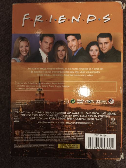Prodajem rabljeni DVD set popularne serije Friends (Prijatelji), deveta sezona s hrvatskim titlovima. DVD kolekcija sadrži kompletnu devetu sezonu omiljene humoristične serije. Odlično očuvano za ljubitelje kultne serije o šestero prijatelja. Cijena 50 € plus poštarina. Šaljem nakon vidljive uplate na račun. Preferiram slanje Tiskom ili Box now paketomata. Pogledajte i ostale moje oglase. Veća količina veći popust.
