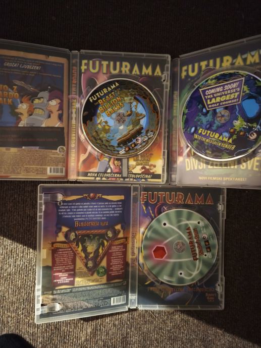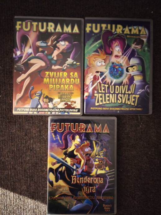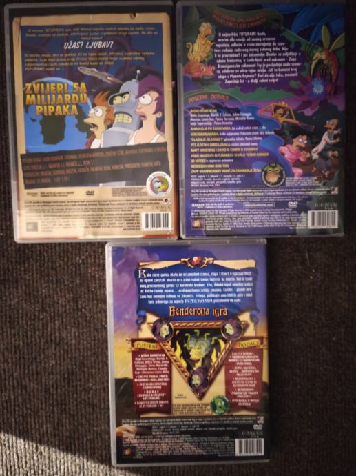 Prodajem rabljenu Futurama DVD Trilogiju koja uključuje tri fantastična filma iz popularne animirane serije. DVD-ovi sadrže naslove "Zvijer sa milijardu pipaka", "U divlji zeleni svijet" i "Benderova igra" s originalnom sinkronizacijom. Svi diskovi su u dobrom stanju i spremni za gledanje uz potpuni doživljaj Futurama avantura. Cijena za komplet 40 € plus poštarina. Šaljem nakon vidljive uplate na račun. Preferiram slanje Tiskom ili Box now paketomatom. Upit preko Njuškala ili Viber i WhatsApp. Pogledajte i ostale moje oglase. Veća količina veći popust.