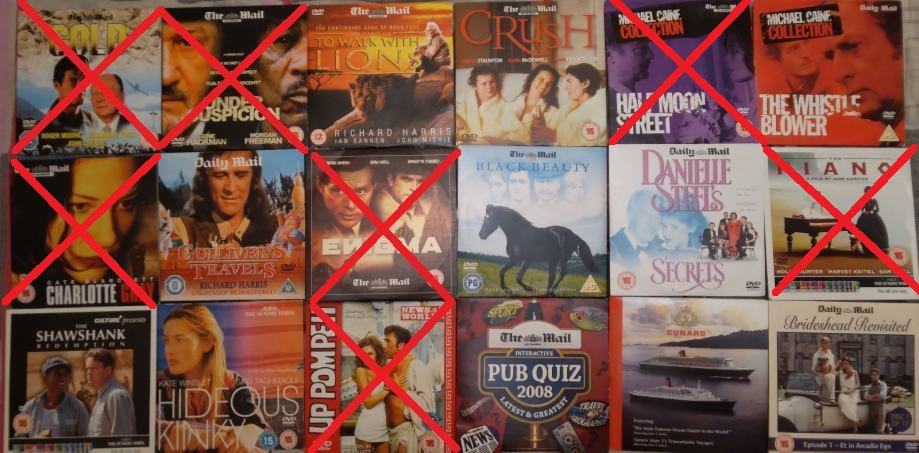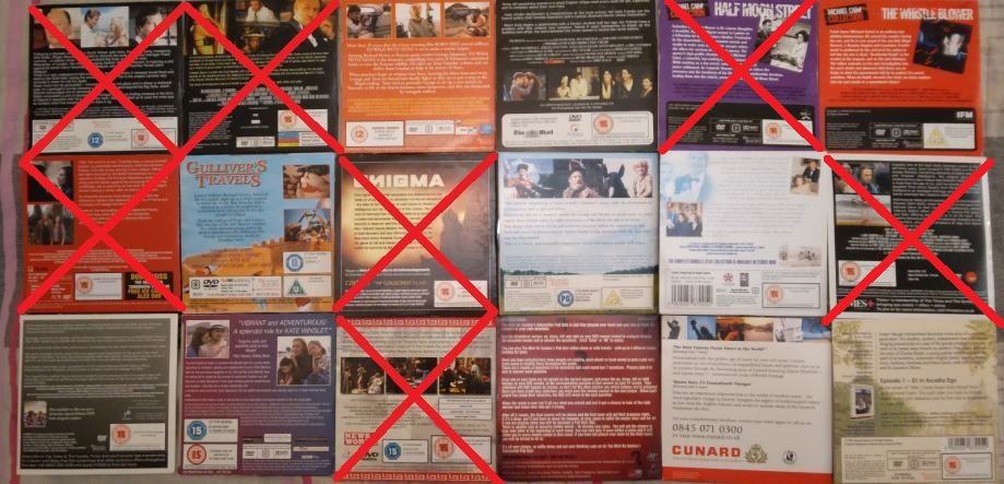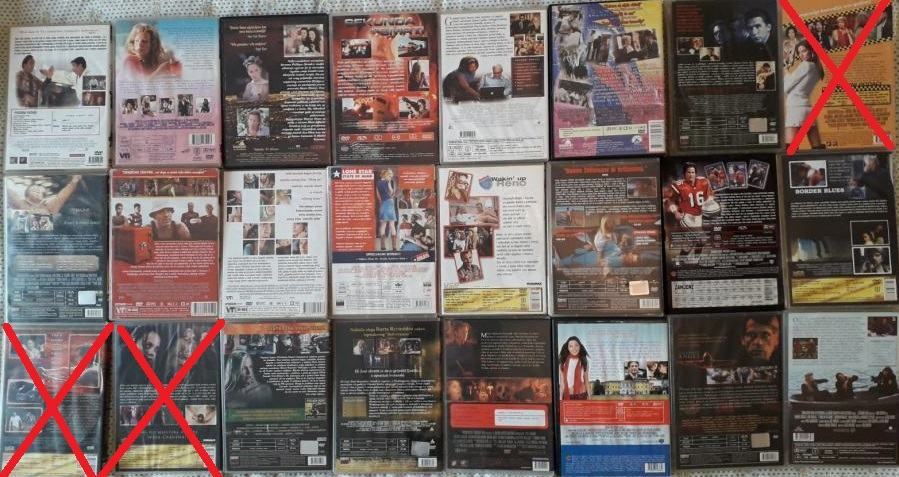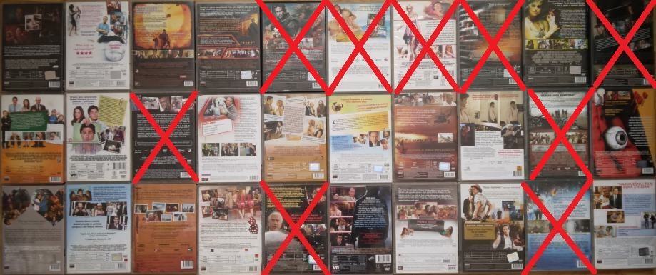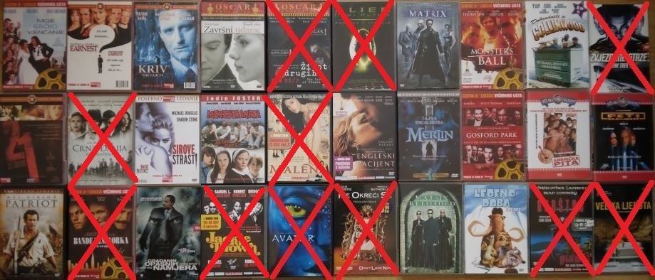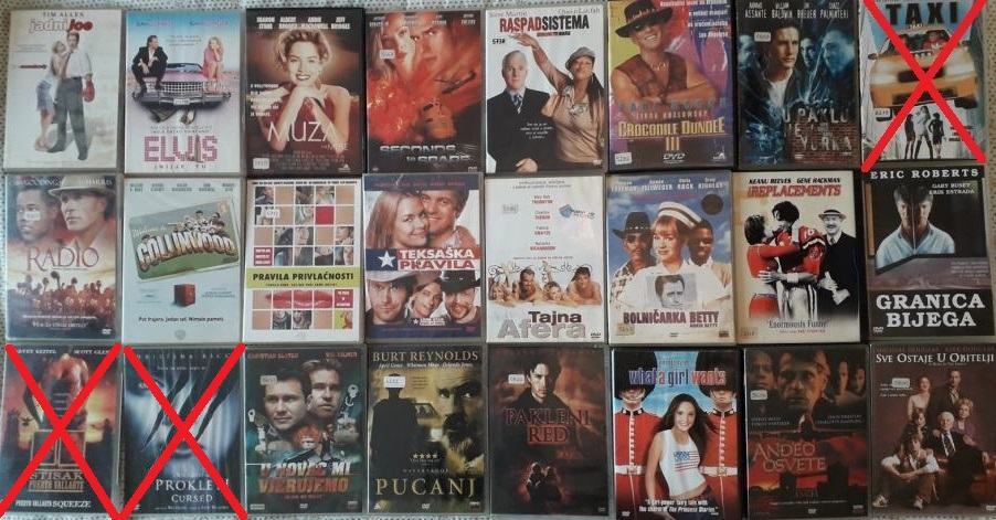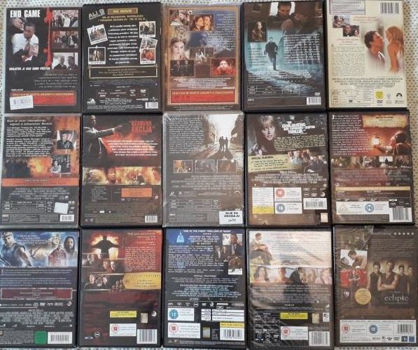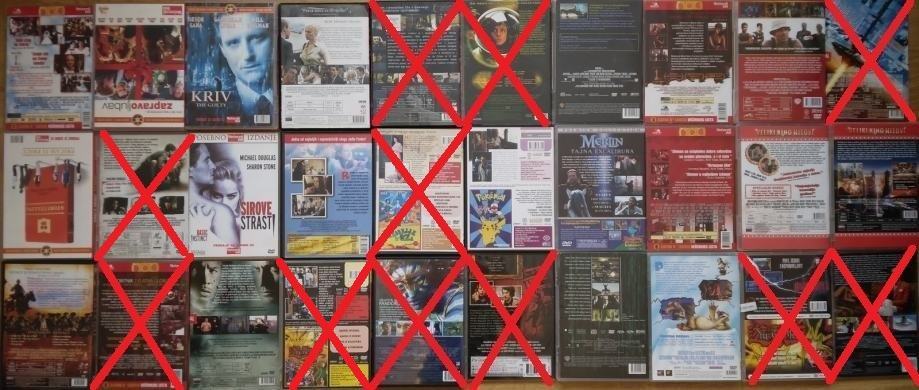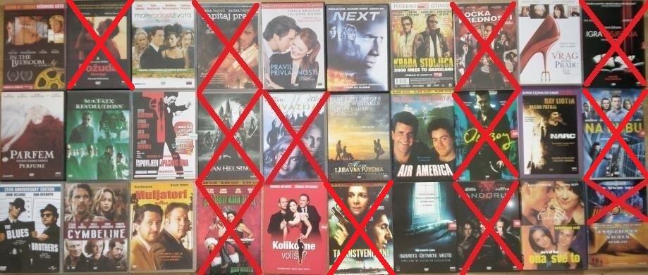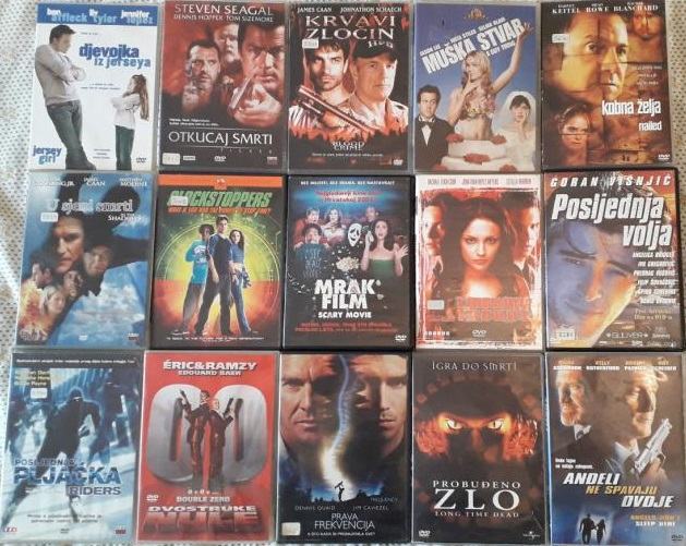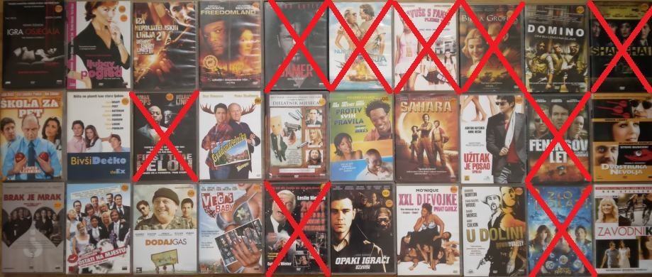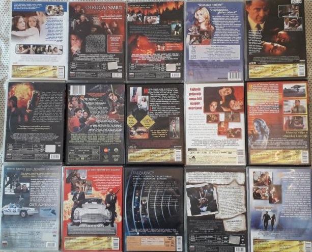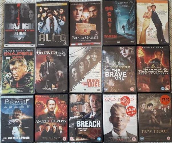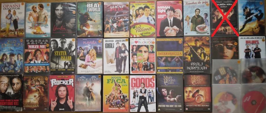 Hrpa fimova na DVDu. Ima tu blockbustera, ima B filmova. Ima novih, ima negledanih, ima iz videoteke, ima ih par bez naših titlova i 4 bez omota. Cijena je 2€ po komadu za ove iz prve dvije skupine (fotografije od 1 do 4) i 1,5€ za ostale (fotografije od 5 do 10). Veliki popusti na količinu pa tako sve prodajem za kumulativno 0,5€ po komadu! Trenutno je to 160 filmova za 80€. Minimalna narudžba je 7€. Novi filmovi redovno dodavani, a fotke kako stignem. Popis u nastavku (hrvatski naslov, pa originalni i na kraju godina)