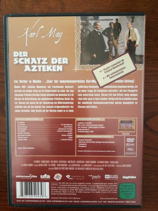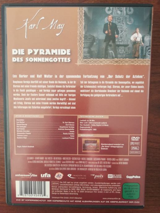 Komplet od 2 DVD-a s kultnim filmovima Piramida boga sunca i Blago Azteka, prema knjigama Karla Maya. Prekrasno pakiranje. Filmovi su u odličnom stanju. Jednom pogledani