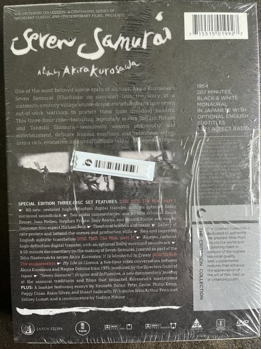 Prodajem jedan od najboljih filmova svih vremena, remekdjelo Akira Kurosawe Seven Samurai. Ovo je izdanje is cijenjene Criterion Collection te se sastoji od 3 DVD-a,a radi se o restoriranoj verziji u trajanju 207 minuta. Filmovi nemaju hrvatski prijevod već isključivo japanski originalni audio i titlove na engleskom jeziku. Novo, neotvoreno, savršeno očuvano, informativna knjižica o filmu i režiseru u prilogu. Samo za istinske filmofile.