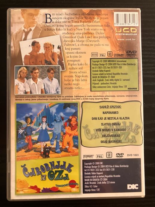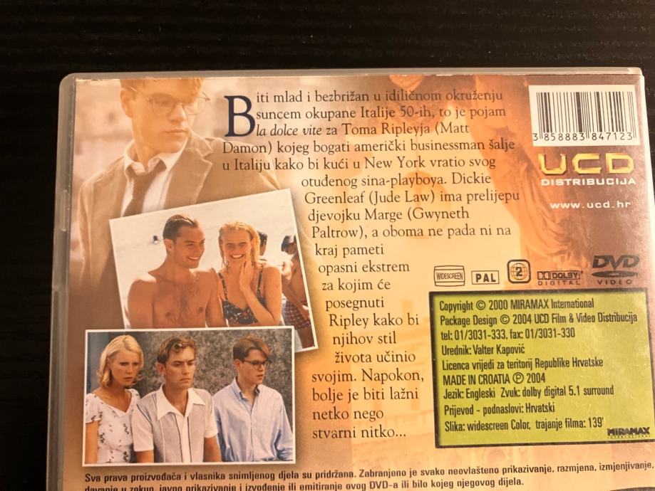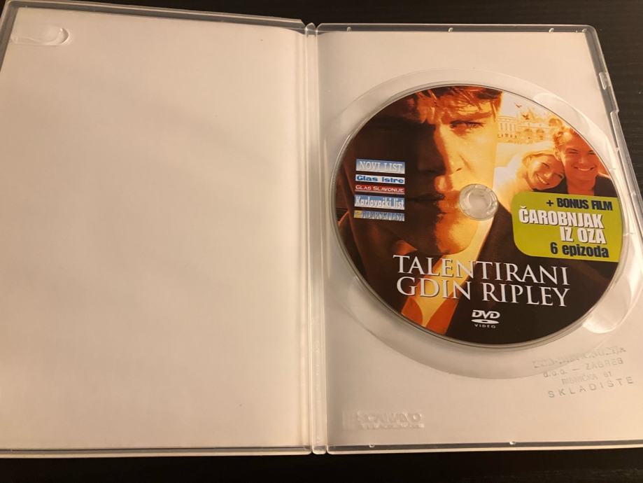 Talentirani gospodin Ripley -DVD original. 6 fotografija je u oglasu. Cijena je 4 EUR, a Troškovi slanja su dodatna 3 EUR Tiskom ili 5 EUR Poštom za unaprijed uplatu na račun ili 6 EUR za plaćanje pouzećem. Slanje s Box Now je 2 EUR. Pakiram tako da je sigurno u transportu. Odgovaram na pozive, poruke putem Njuškala, SMS, Viber…