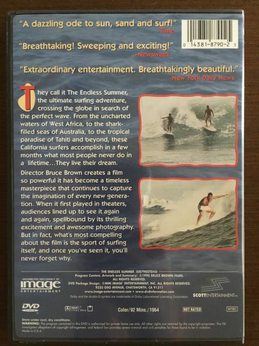1966.; 95 min; USA; NTSC 1; ENG; režija: Bruce Brown; produkcija: Bruce Brown Productions; Documentary; Surfing