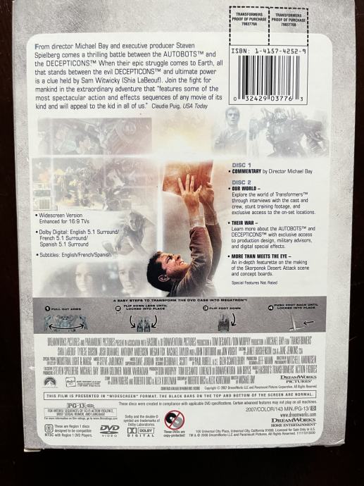 2007.; 163min.; USA; NTSC; ENG; režija: Michael Bay; scenarij: Roberto Orci; glume: Shia LaBeouf, Megan Fox; produkcija: Paramount Pictures / DreamWorks Pictures
