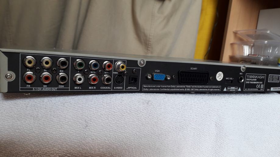 Brand je Yamakashi, a model Yakamashi XXX. Ima 5.1 audio izlaze, VGA + Scart, mikrofonski ulaz i miksanje. Kod uključenja se ne pali jer je vjerojatno otišao osigurač. Za iskusnog majstora lako rješiv problem. Zato deklariram za dijelove. U odličnom je estetskom stanju, kao nov.