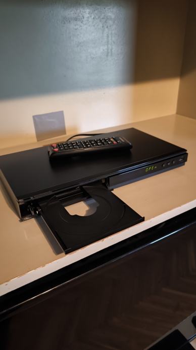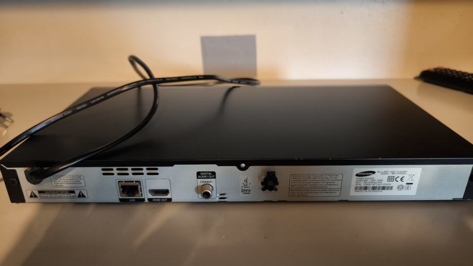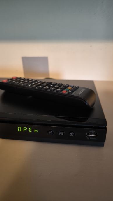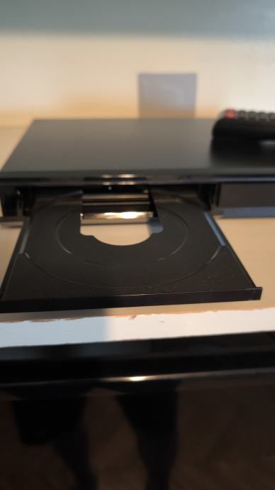 Prodajem malo korišten Samsung BD E5500 Blu-ray player u odličnom stanju s pripadajućim daljinskim upravljačem. Uređaj je potpuno funkcionalan, s otvorenom ladicom za disk vidljivom na slici. Elegantnog je i tankog dizajna, idealan za sve ljubitelje kvalitetne reprodukcije filmova i glazbe.