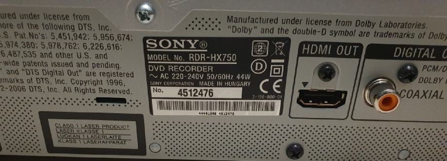 SONY RDR-HX750 - HDD/DVD snimač. Moguća ugradnja HDD-a do 500GB.