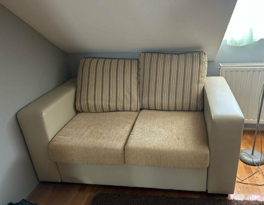 Dvosjed (krem boje sjedala, žućkasta boja rukohvata, smeđe- krem boja jastuka). Korišten, ali očuvan, identičan kao na fotografiji.