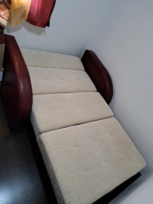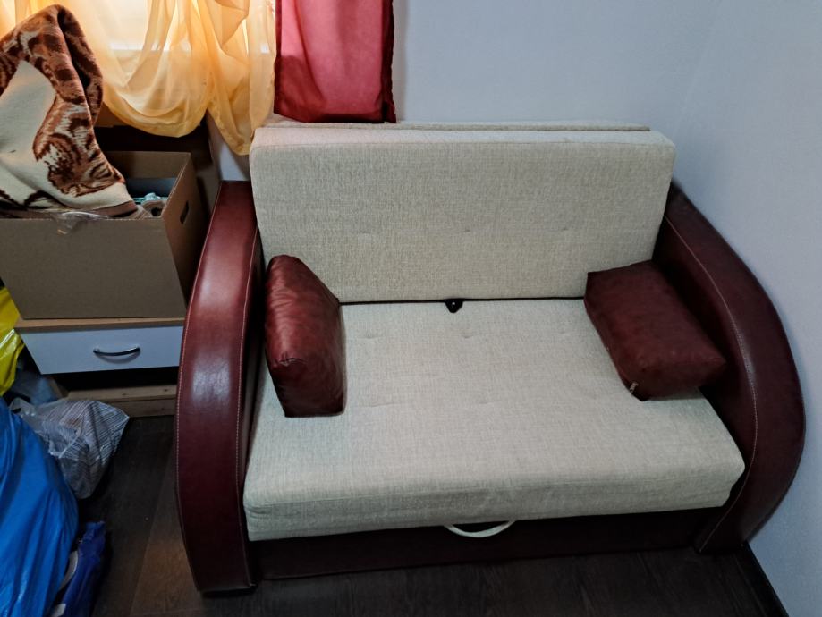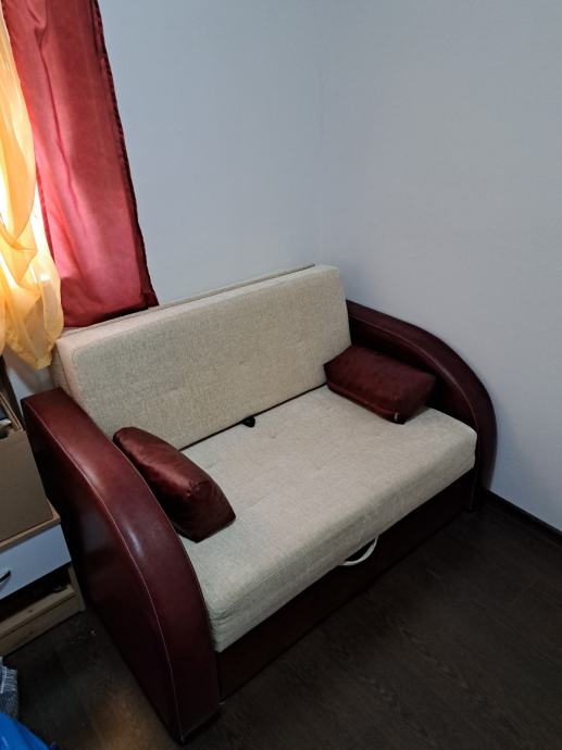 Prodaje se kauc koji se razvlaci u krevet.Kombinacija bež i trule visnje boje.Koristen malo i nikako samo stoji i skuplja prašinu.Predivno se ukomponira u prostor i udoban.Lokacija Solin, moze se doci pogledati i razmontirati radi lakseg transporta. Cijena nije fiksna i u cijenu ulaze 2 jastuka u istoj boji.