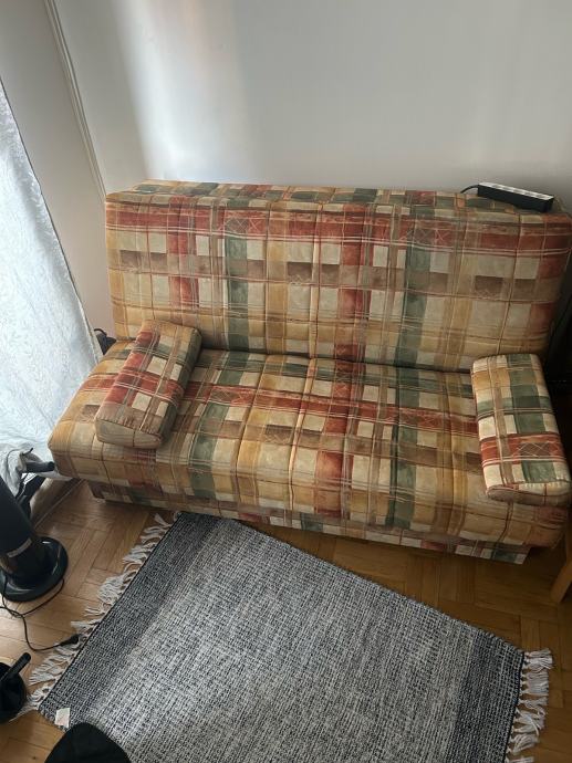 Prodajem kauč na razvlačenje s presvlakom u kariranom uzorku koji kombinira nijanse crvene, zelene, bež i smeđe boje. Kauč ima dva manja jastuka za naslone sa strane te se može razvući u ležaj, što ga čini praktičnim za svakodnevno korištenje ili za smještaj gostiju.