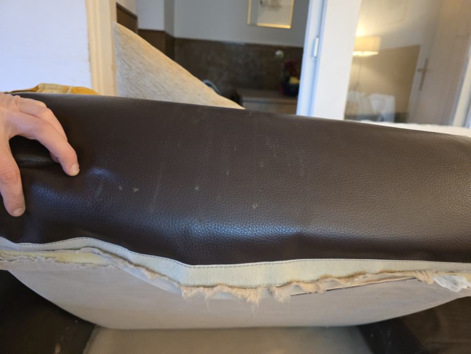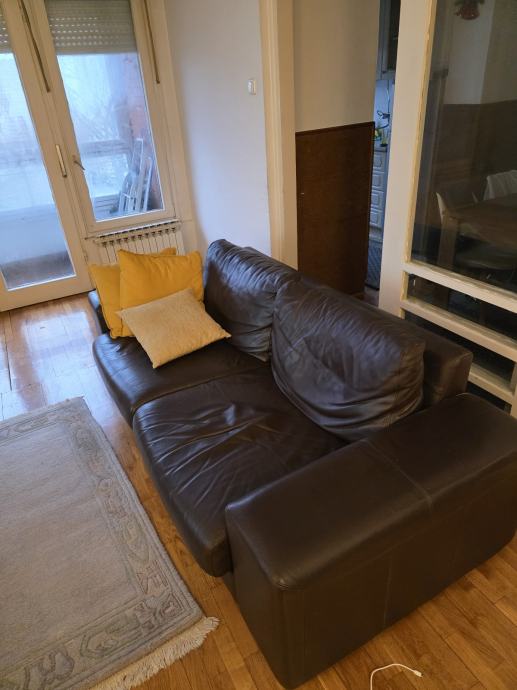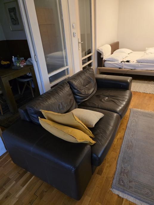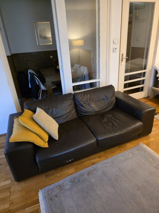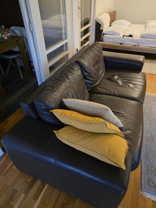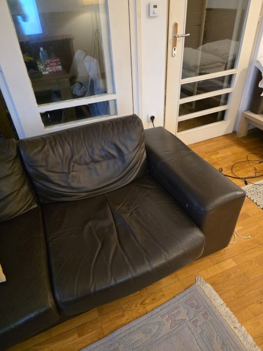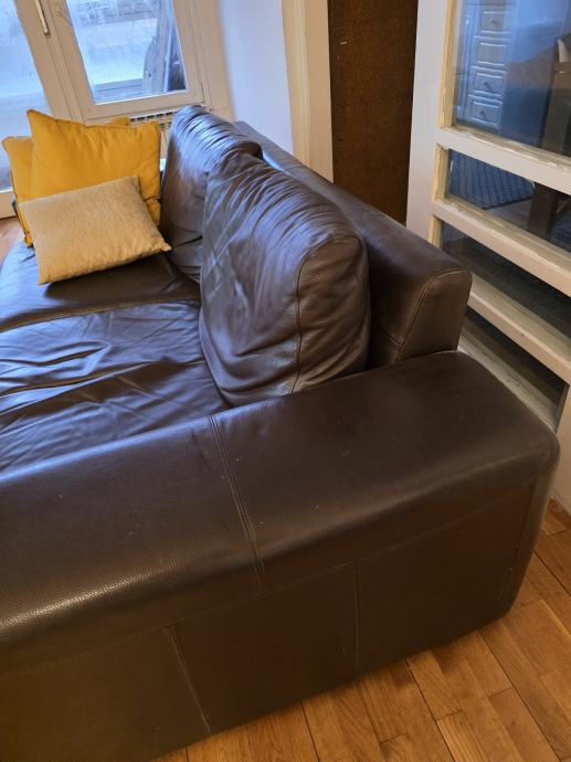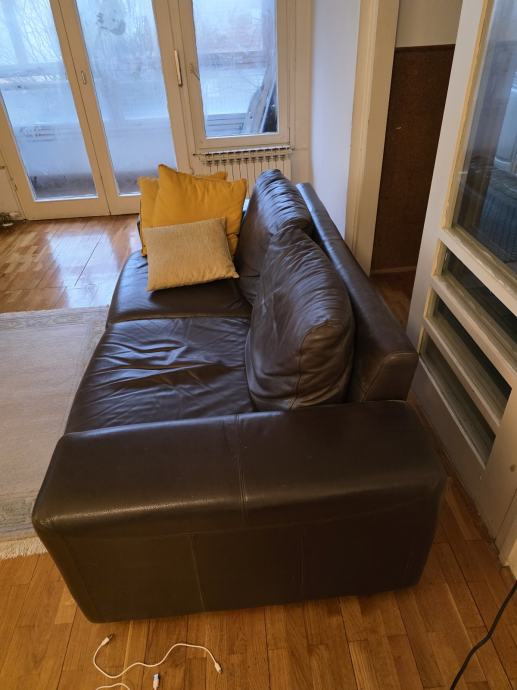 Tamnosmeđi kožni dvosjed, očuvan, bez ikakvih vanjskih ostećenja kože (prava koža, nije skaj)- danas slikano. (poderana podstava jednog od jastuka - vidljivo na slici, ne vidi se izvana).
