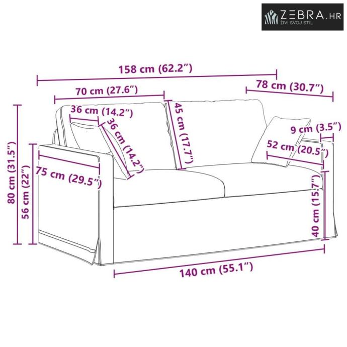 Baršunasti presvlake: Sofa je obložena bogatim baršunastim materijalom koji donosi eleganciju, a istovremeno pruža ugodnu površinu za sjedenje. Baršun je odabran zbog prozračnosti, što poboljšava udobnost bez gubitka stila. Njegova glatka tekstura dodaje vizualnu privlačnost vašem prostoru, čineći ga idealnom centralnom točkom u svakom interijeru.