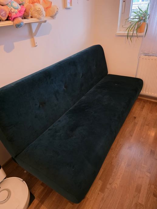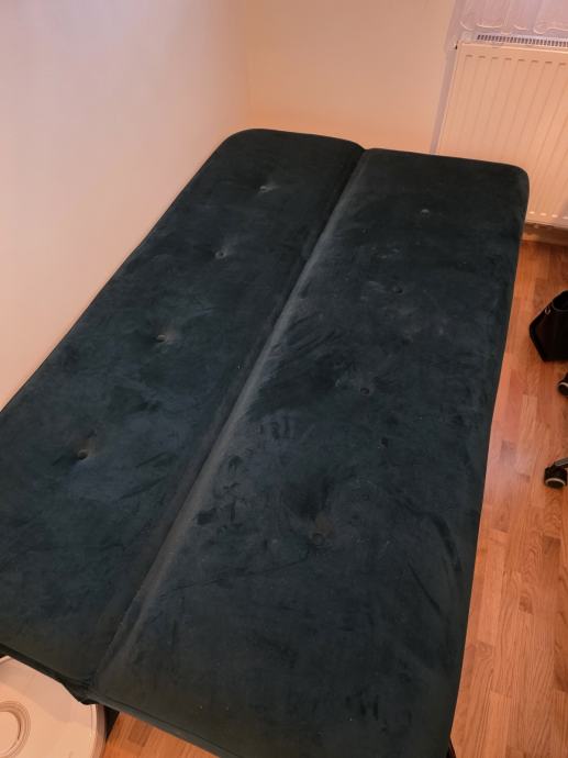 Tamnozeleni dvosjed koji se moze rasklopiti u ležaj cca 185x115 cm. Korišten kao rezervni ležaj za kad neko dođe goste, što znači da je korišten svega 3-5 puta godišnje,. Ima par flekica koje bi trebalo samo malo bolje istrljati. Ne šaljem poštom, isključivo osobno preuzimanje.