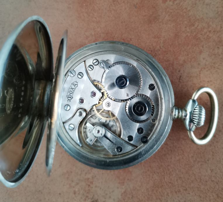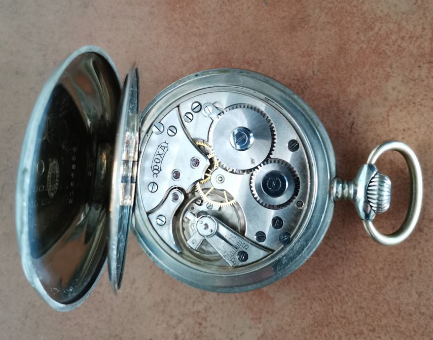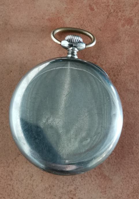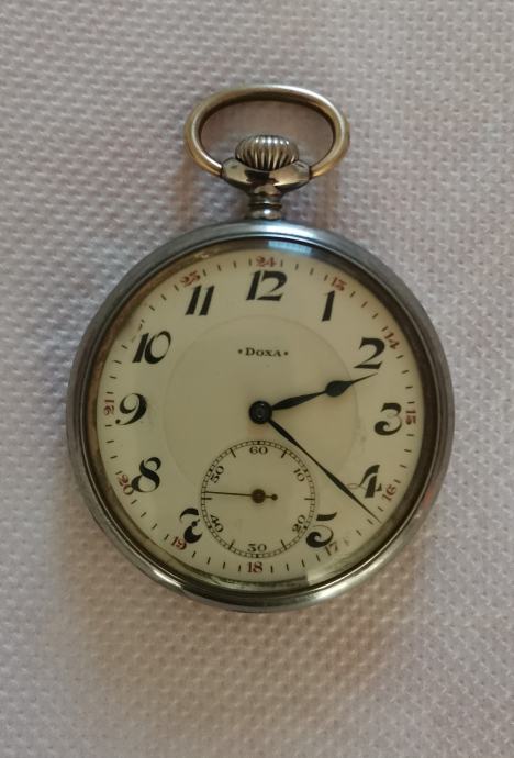 DŽEPNI SAT "DOXA" ..argebntan kućište (njemačko srebro)...velika-promjer 53,7 mm bez vrata, krunice i bove... keramički cifer...mehanizam call 19 (FHF)..Breguet spirala...bimetalni vijak ..15 jewels...
