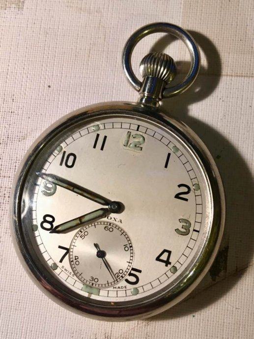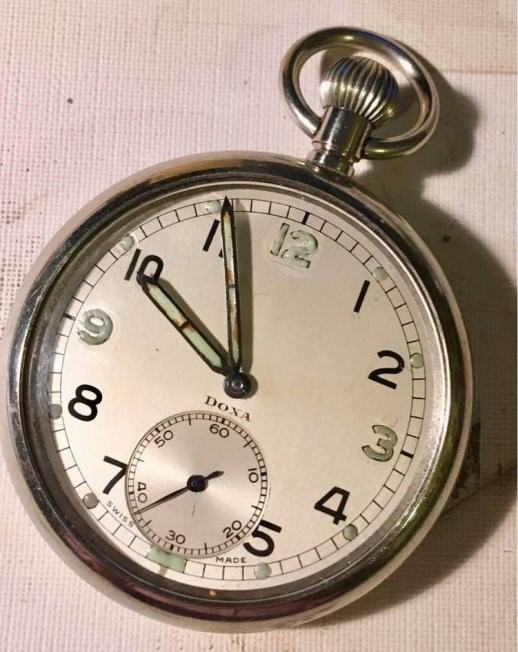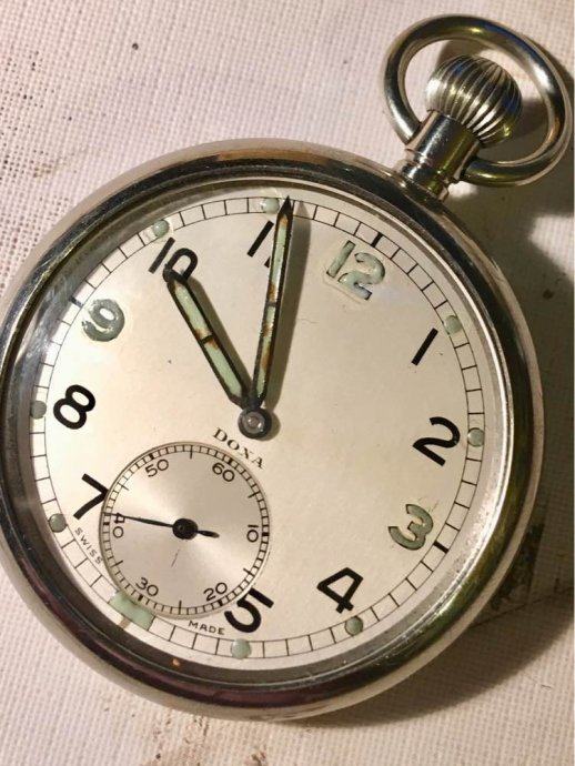 WW2 DŽEPNI VOJNI SAT "DOXA" ZA BRITANSKU VOJSKU,.....DOBRO SAČUVANO STANJE.. promjer 52 mm bez vrata, krunice i bove..debljina 13,2 mm ..SERVISIRANA, ISPRAVNA I TOČNA.