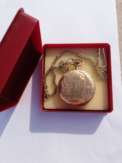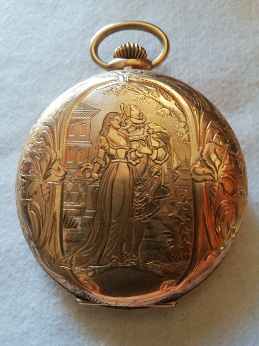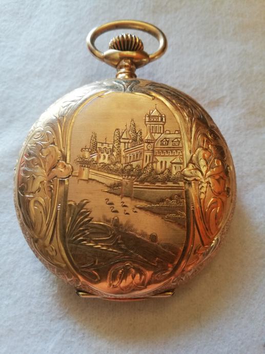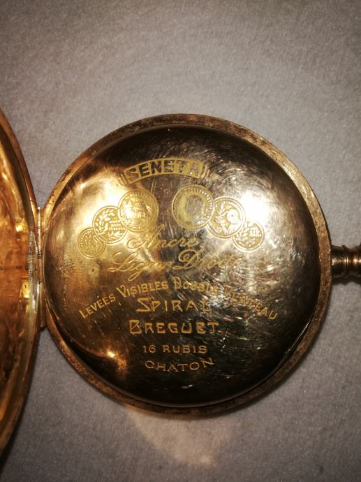 Sat je promjera 50 mm, ima masu od 83 g od čega 43 g otpada na mehanizam, a 40 g je čisto 14-karatno zlato sa serijskim brojem 144720. Samo zlato vrijedi cca 1000 E, dok je kolekcionarska vrijednost višestruka. Takva masa sata daje osjećaj punoće i težine koja u šaci ostavlja moćan dojam. Gravura kraljevskog dvorca uz rijeku je umjetničko djelo, kao i plemićki par na drugoj strani. Sat je ispravan i radi kao sat. Lov na raritetni SENETA Ancre Ligne Droite Leves Visibles Double Plateau SPIRAL BREGUET 16 Rubis Chaton je počeo, pa ajmoooo !!!