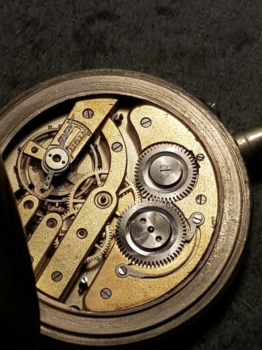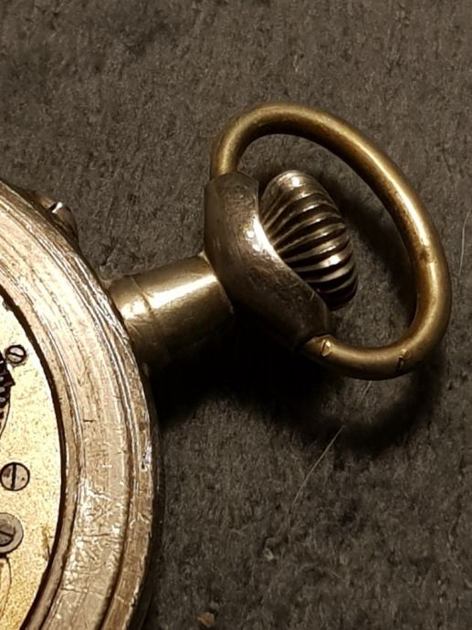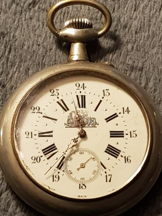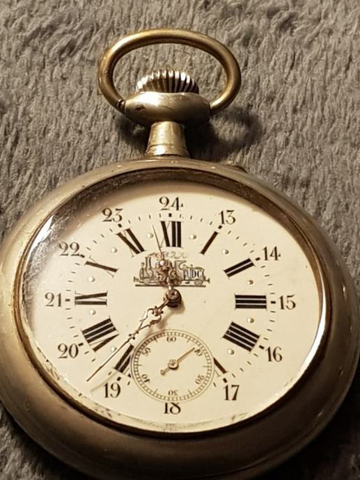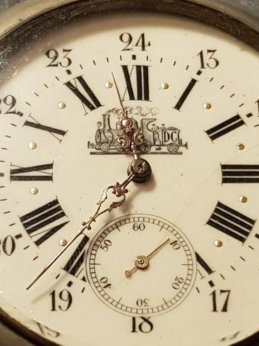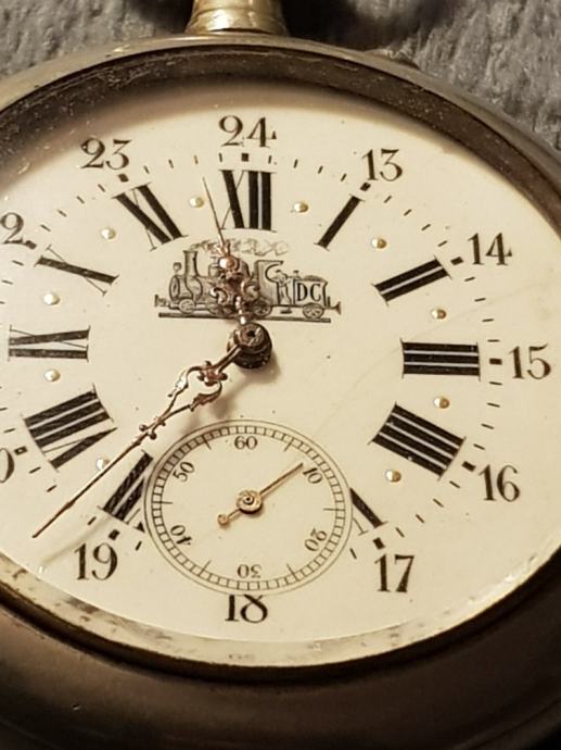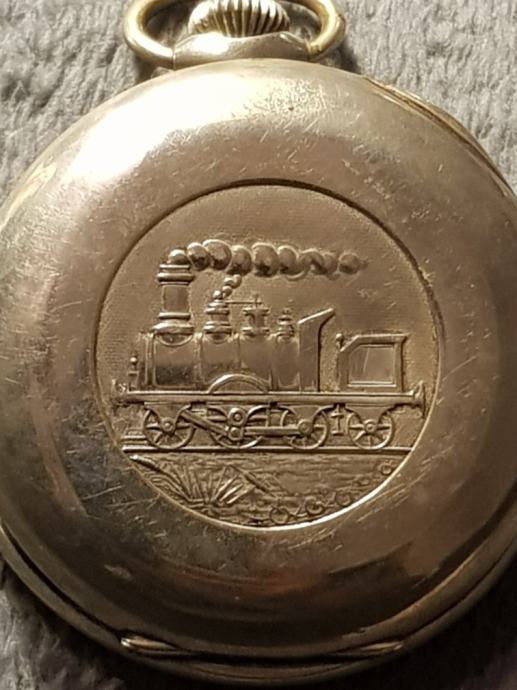 Veliki đepni sat sa motivom lokomotive na zadnjem poklopcu. Sat je nedavno prestao funkcionirati. Promijer sata 6 cm