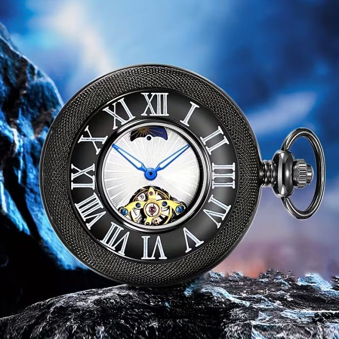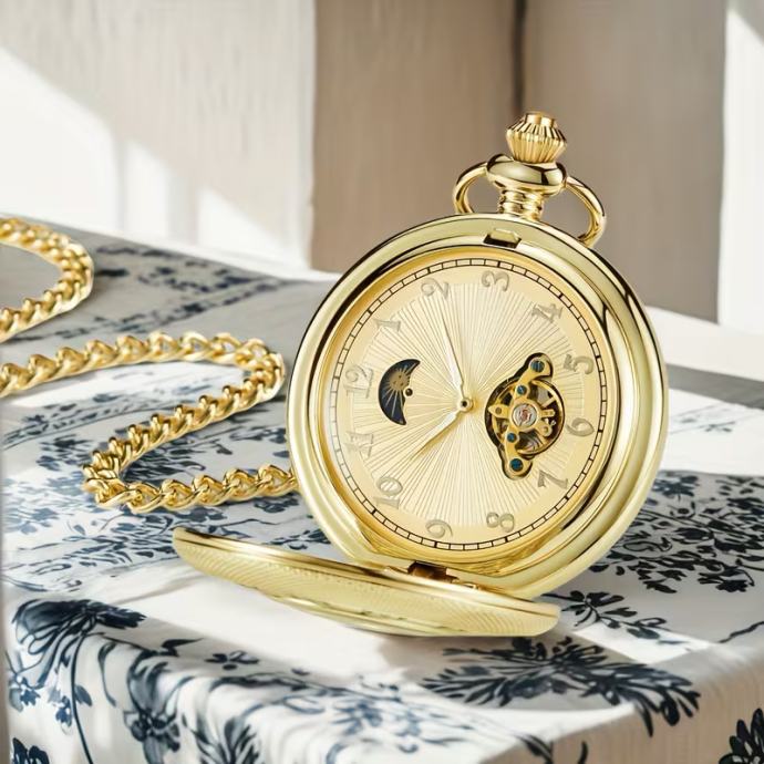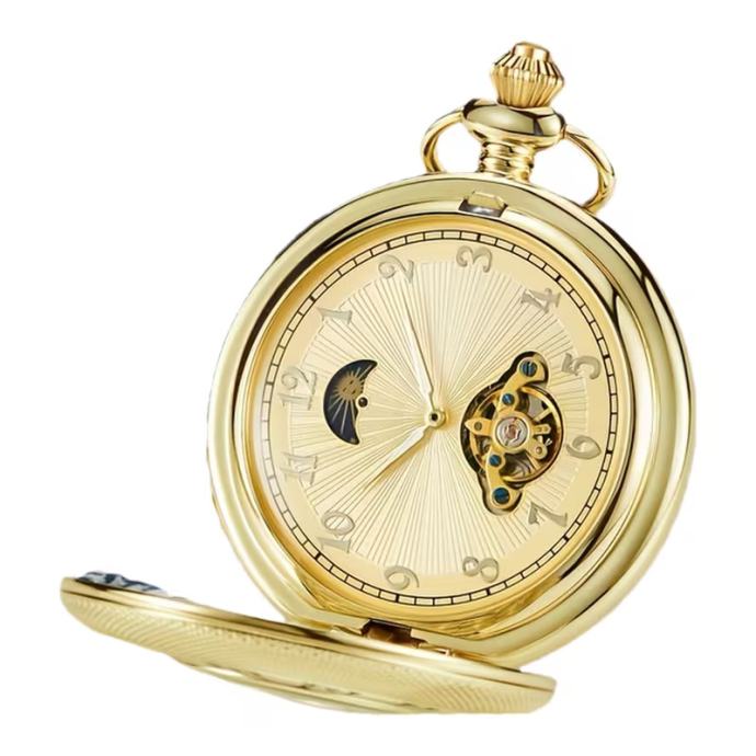 Vintage potpuno automatski mehanički džepni sat s privjeskom Sunce, Mjesec i zvijezda - zadebljani lanac, rimski brojevi, zlatni brojčanik, mehanički mehanizam, idealan za Božić, Novu godinu, rođendanske poklone, godišnjice braka, najbolji za Božić