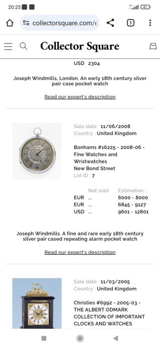 Vrlo rijedak i vrijedan dvorski džepni sat iz davnih vremena 18 stoljeća. Obitelj Josepha Windmillsa je u ta davna vremena održavala ulične satove u Londonu ali su s vremenom krenuli proizvoditi i manje džepne koji se rijetko nađu u prodaji i na tržištu i vrlo su cijenjeni kod kolekcionara. Uzevši u obzir inflaciju i to da je ovaj koji nudimo u prodaji vrijedniji zbog grba engleske kraljevske obitelji i original kopče iz toga vremena što znači da ga je imao u vlasništvu i nosio netko s engleskog dvora možda i sama kraljica.