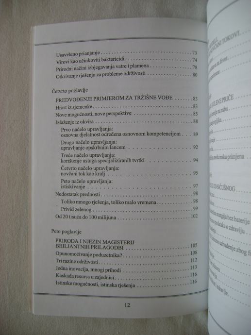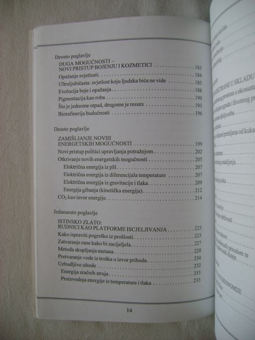 „Zamisli s kojima ćete se susresti u ovoj knjizi među najprivlačnijim su mogućnostima za ostvarenje konkurentne niskougljične i štedljive ekonomije 21. stoljeća. Potrebno je istaknuti da će neke od najvećih mogućnosti za stvaranje radnih mjesta proizaći iz oponašanja učinkovitosti ekosustava koji ne stvara otpad. Svijet prirode je, u svom svojem sjaju i raznolikosti, već spretno, neočekivano i na kontraintuitivne načine riješio mnoge probleme održivosti s kojima se čovječanstvo suočilo. Kad bi ljudska bića samo mogla shvatiti zapanjujuću kemiju, procese, strukture i ustrojstva koje su organizmi – od bakterija i mekušaca do gmazova i sisavaca – tisućljećima razvijali i iskušavali, možda bismo raspolagali novim i preobražajnim rješenjima za mnoge izazove s kojima se suočava šest milijardi ljudi ovog planeta, kojih će do 2050. godine biti više od devet milijardi.“