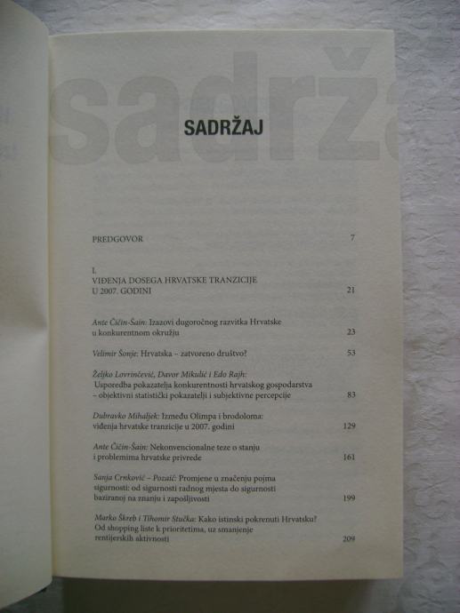 "Zbornik sadrži 13 rukopisa prezentiranih za konferenciji koja je održana na Zagrebačkoj školi ekonomije i menadžmenta 18. lipnja 2007. godine, na poticaj Dr Ante Čičin-Šaina, koji je ujedno pripremio uvodno slovo te dva rada. Radovi prezentirani na konferenciji odrazili su dva povezana motiva: 1. pokušaj da se promisle izazovi koje pred Hrvatsku postavlja globalizacija svjetske ekonomije; 2. potreba da se podigne razina javne rasprave o ekonomskoj politici, koja je često opterećena stereotipima i populističkom retorikom.