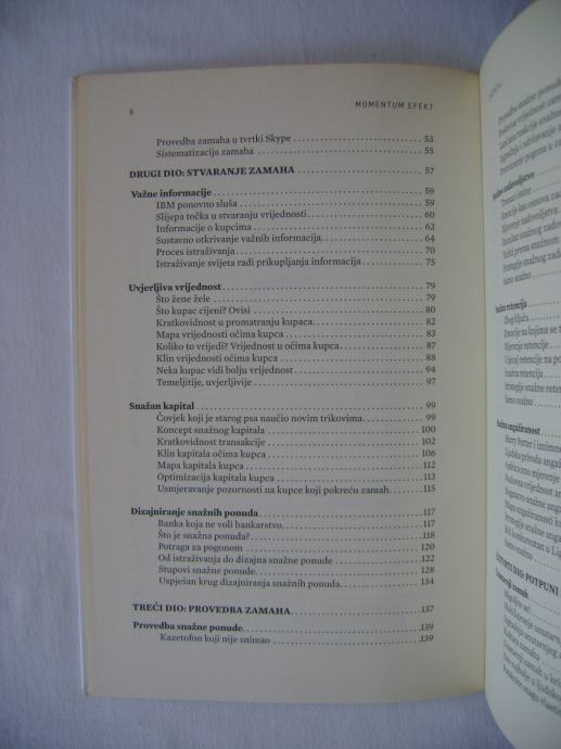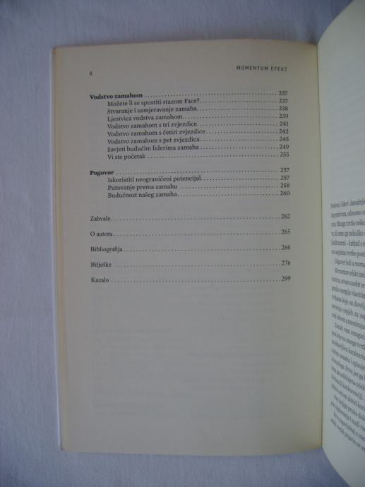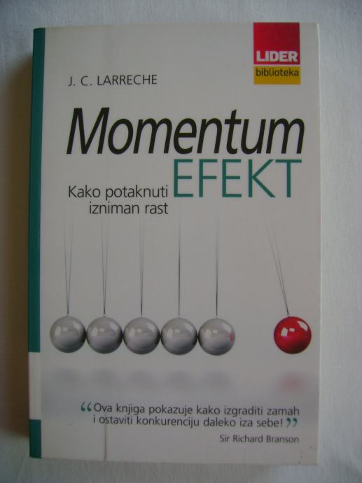 "Rijetke su tvrtke otkrile tajnu održivog visokog rasta: zamah. Te su tvrtke naučile kako stvoriti uvjete koji vode prema izuzetnom organskom rastu koji se hrani samim sobom, neprekidno poboljšavajući poslovanje. U knjizi ‘Momentum efekt’ autor J. C. Larreche pojašnjava cjelokupni okvir stvaranja zamaha, zadržavanja i primjene njegove snage. Koristeći se novim istraživanjima i snažnim studijama slučaja, Larreche ukazuje na nevjerojatnu ulogu zamaha u stvaranju vrijednosti. Prikazuje proces razvoja snažnih ponuda koje se nalaze u središtu ove snažne sile.
