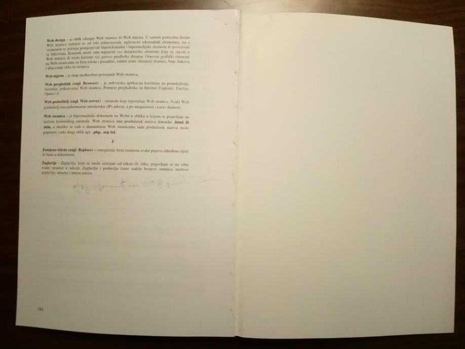Ovaj priručnik je u dobrom stanju. Piše na internetu da originalno ima 184 stranice, ali na 184. stranici gdje završava rječnik izgleda kao da fali list ili dva (pretpostavljam obični bijeli list ili listovi koji nisu imali neki sadržaj; vidjeti sliku).