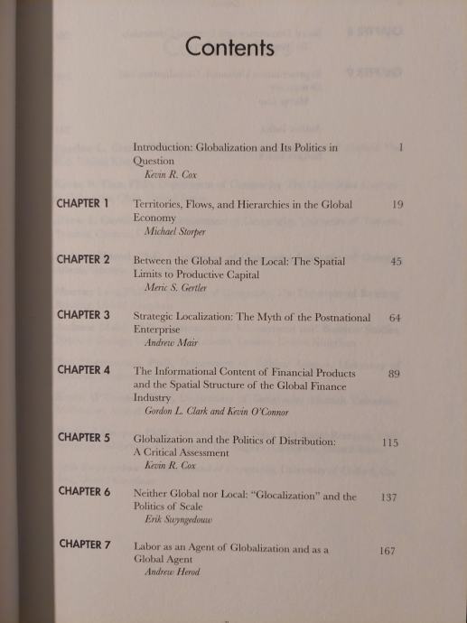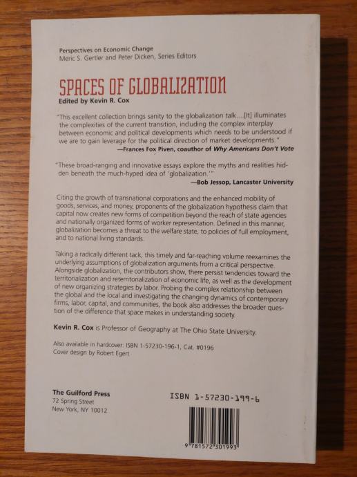 Argumenti o globalizaciji ekonomskih odnosa postali su uobičajeni; dio svakodnevne prehrane društvenih znanosti i javnih poslova. Pozivajući se na rast multinacionalnih i transnacionalnih korporacija, te povećanu mobilnost roba, usluga i novca, zagovornici hipoteze o globalizaciji tvrde da kapital sada stvara nove oblike konkurencije izvan dosega državnih agencija i nacionalno organiziranih oblika radničkog predstavljanja. Ovako definirana, globalizacija postaje prijetnja socijalnoj državi, politici pune zaposlenosti i nacionalnom životnom standardu. Koristeći radikalno drugačiji pristup, ova pravovremena i dalekosežna knjiga preispituje temeljne pretpostavke argumenata o globalizaciji iz kritičke perspektive. Uz globalizaciju, pokazuju autori, opstaju tendencije prema teritorijalizaciji i reteritorijalizaciji gospodarskog života, kao i razvoju novih organizacijskih strategija rada. Ispitujući složeni odnos između globalnog i lokalnog i istražujući promjenjivu dinamiku suvremenih tvrtki, rada, kapitala i zajednica, knjiga se također bavi širim pitanjem razlike koju prostor čini u razumijevanju društva.