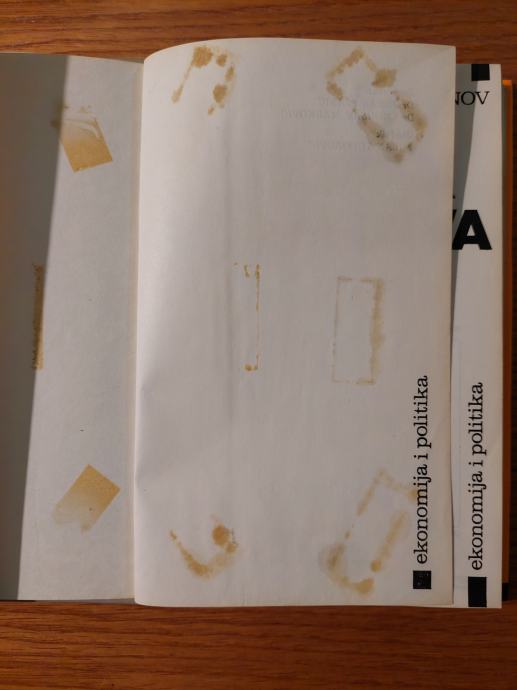Sa unutrašnje strane stražnje i prednje korice i na prvoj i posljednjoj stranici - tragovi odstranjivanja selotejp ljepila jer je knjiga bila u zaštitnoj foliji (prikazano na fotografiji).