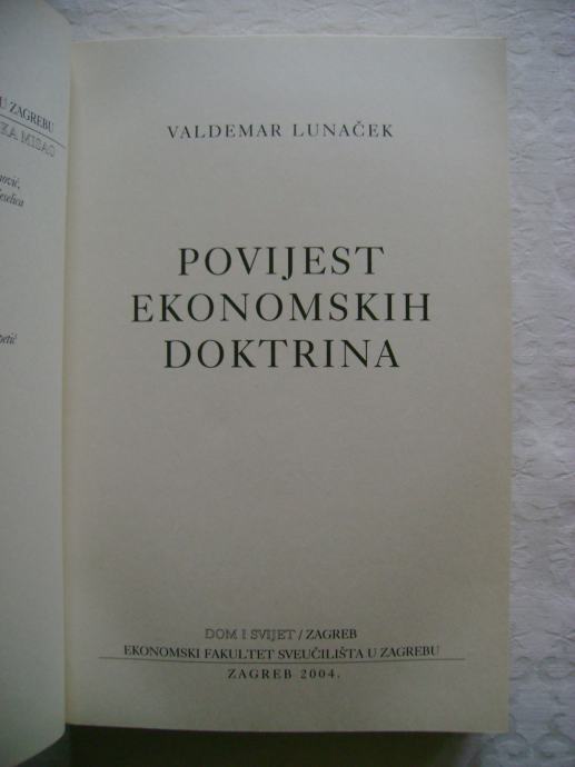 Valdemar Lunaček - Povijest ekonomskih doktrina - izdavači Dom i svijet i Ekonomski fakultet Sveučilišta u Zagrebu, Zagreb 2004. godine, 16 x 23 cm, meki uvez sa preklopom, 401 stranica.
