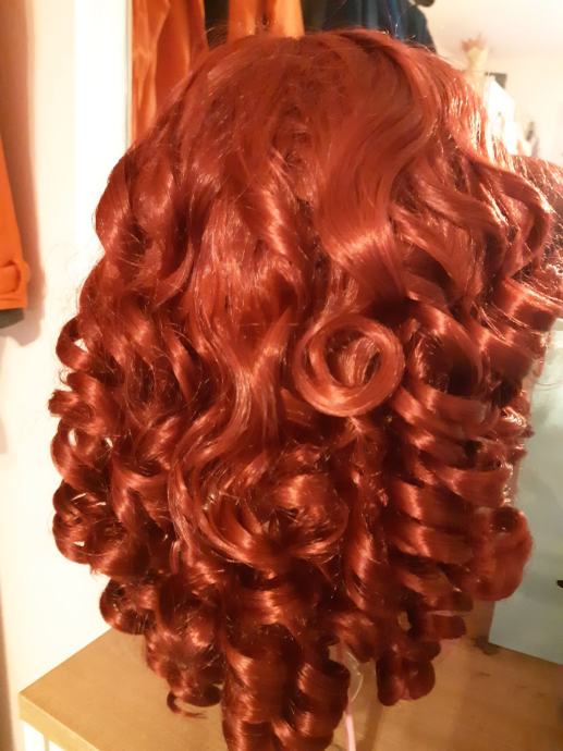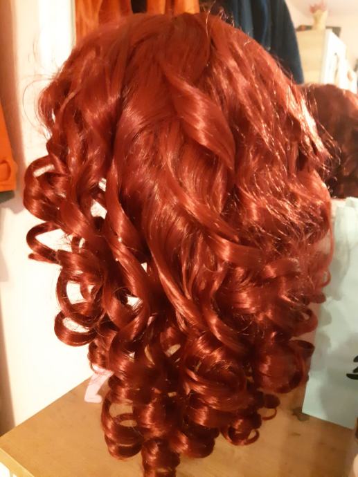 Nova izuzetno moderna sintetička perika Kinky Curly (dobivena na poklon), može se oblikovati, kapa opseg 56.5 cm, srednja dužina, boja:burgundac, otporno na toplinu.