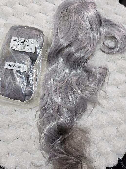 Prodajem novu periku s dugim, valovitim pramenovima u sivoj boji. Perika je u nekorištena. Kosa je mekana i prirodnog izgleda, s bogatim valovima po cijeloj dužini.