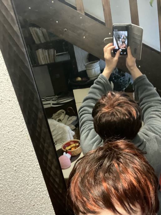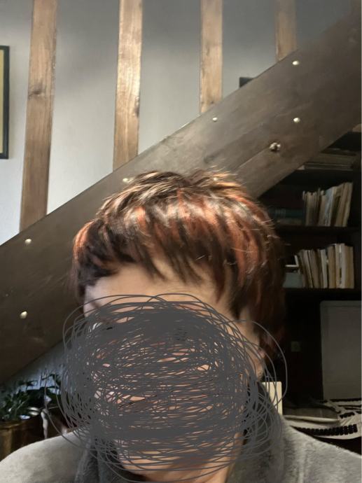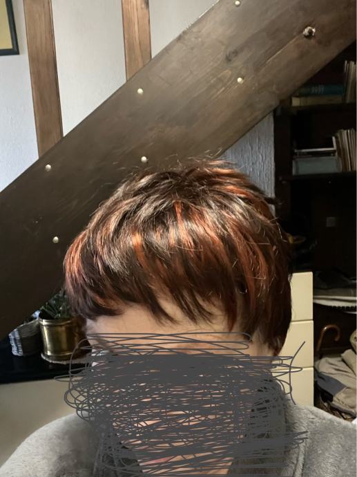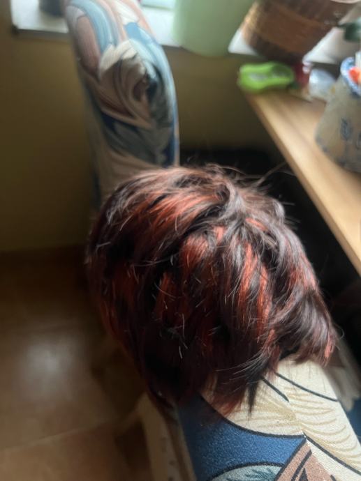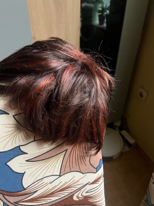 Prodajem novu periku kratke frizure u smeđoj boji s narančasto-crvenim pramenovima. Perika ima prirodan izgled i strukturu kose, s višebojnim efektom koji daje dubinu i volumen. - 10 eu