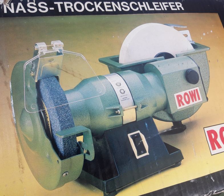 Profesionalno tocilo, brus za oštrenje sječiva... ROWI Njemačke proizvodnje, kupljeno davne 1990.godine, tada koštalo 459 DM. Stolnije stroj, ima gumene nogice a težine je 10 kg. Izrađen je od metala i aluminiuma. Ima kamen za grubo brusenje sječiva, koje se ne vrti prebrzo tako da ne grije sječivo, te vrlo fini kamen sa posudom za vodu koje se sporo vrti I ujedno hladi sječivo. Potpuno je novo i nikada nije korišteno. Prodajem ga za 95 eura. Mob 091 444 4281