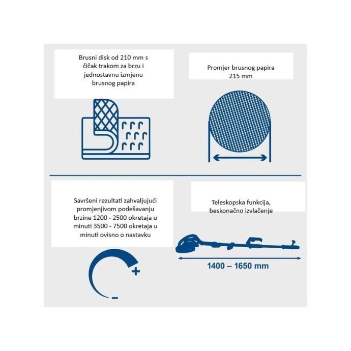 Okrugla glava koristi brusni disk Ø215 mm, a brzina okruglog diska podešava se u rasponu 1200–2500 o/min za prilagodbu podlozi i fazi obrade.
