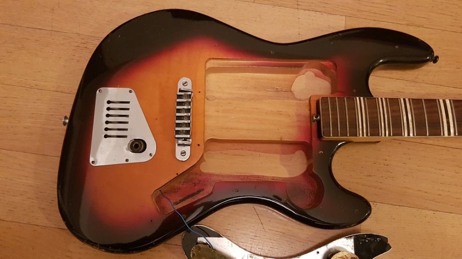 Hoffner, Galaxy 176, iz vremena The Beatles -a; na gitari nedostaje tremolo ručica. Neck pickup je potrebno premotati (ne radi). ostala elektronika je original, i nije lemljena ili nešto mijenjano. Na glavi je još naljepnica music shopa u njemačkoj sa četveroznamenkastim telefonskim brojem! :-) Gitara je sa minimalnim ulaganjem spremna za kolekciju!