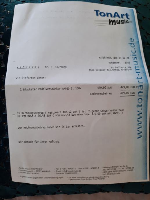 Prodajem gitarsko pojačalo Blackstar Amped 2 snage 100w u obliku pedale (može i 20w ili 1w za kućnu vježbu) s efektima. Vrlo praktična pedala za vježbu, svirke i slično, jer ne treba nositi pojačalo za sve. U osnovi je to cijevno pojačalo s digitalnim efektima. Uzmete ovu pedalu koja teži samo 2 kg, stavite u ruksak i idete na vježbu ili svirke. Pedalu sam kupio u Njemačkoj i postoji i račun, koji je na slici. Pedala je veoma očuvana, uvijek nožena u kovčegu i izgleda kao nova. Sve funkcioniše besprekorno. Podatke i recenzije pedale možete vidjeti na online. Pedalu mogu dovesti do granice uz nešto malo za benzin.