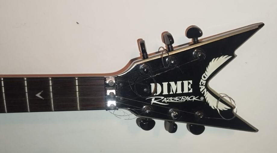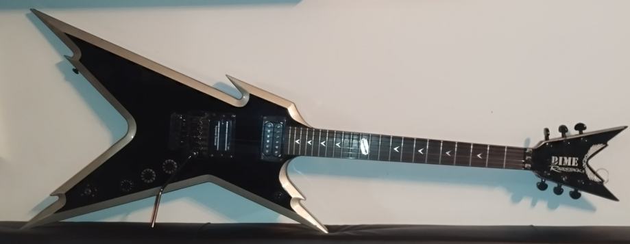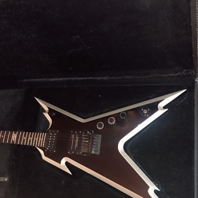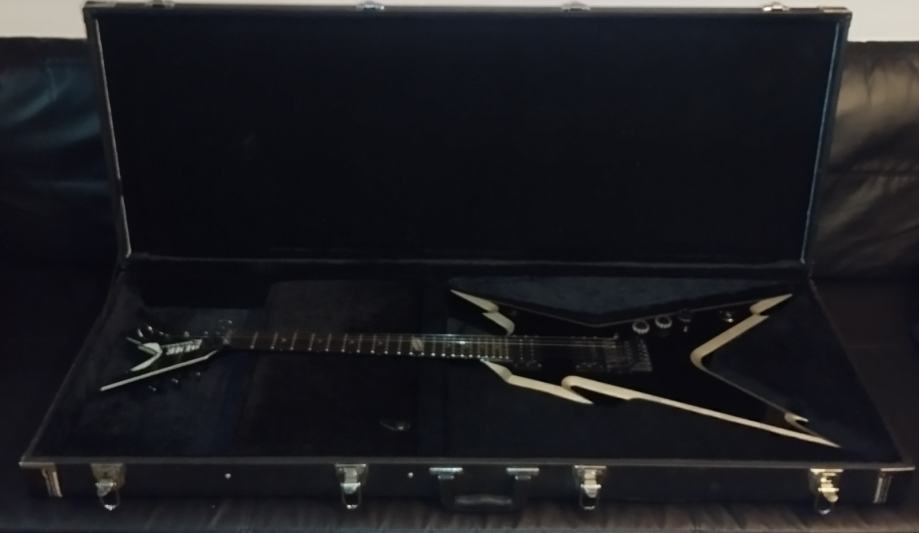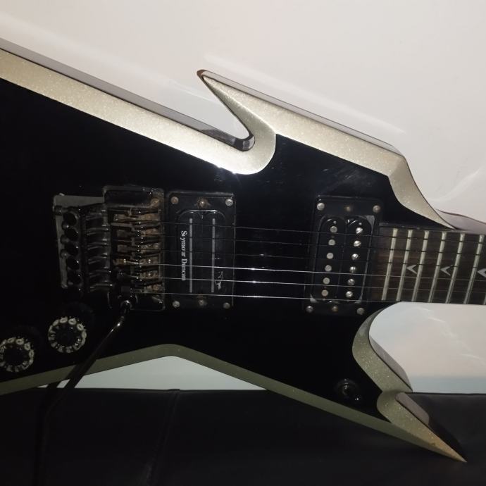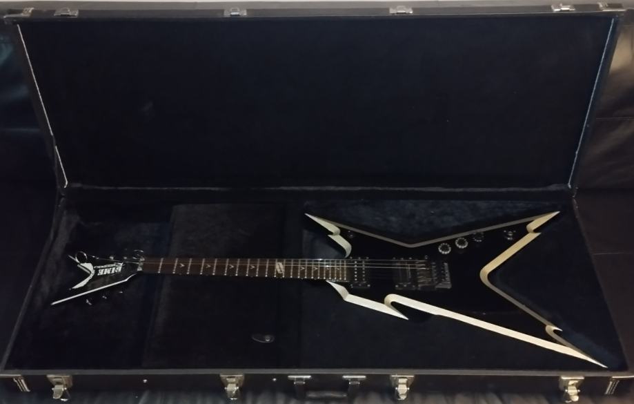 Dimebag Darrell (Pantera) model. Dean Razorback Two-Tone Black/Silver - Mahogany body w/ Set Neck Construction, Pearl Razor Inlay, Floyd Rose Licensed Tremolo, Dimebucker Bridge Pickup, Dean High-Output Neck Pickup, Dimebag "Traction" Knobs, Hardshell Case Included (Dean Fly Case). Made in Korea.
