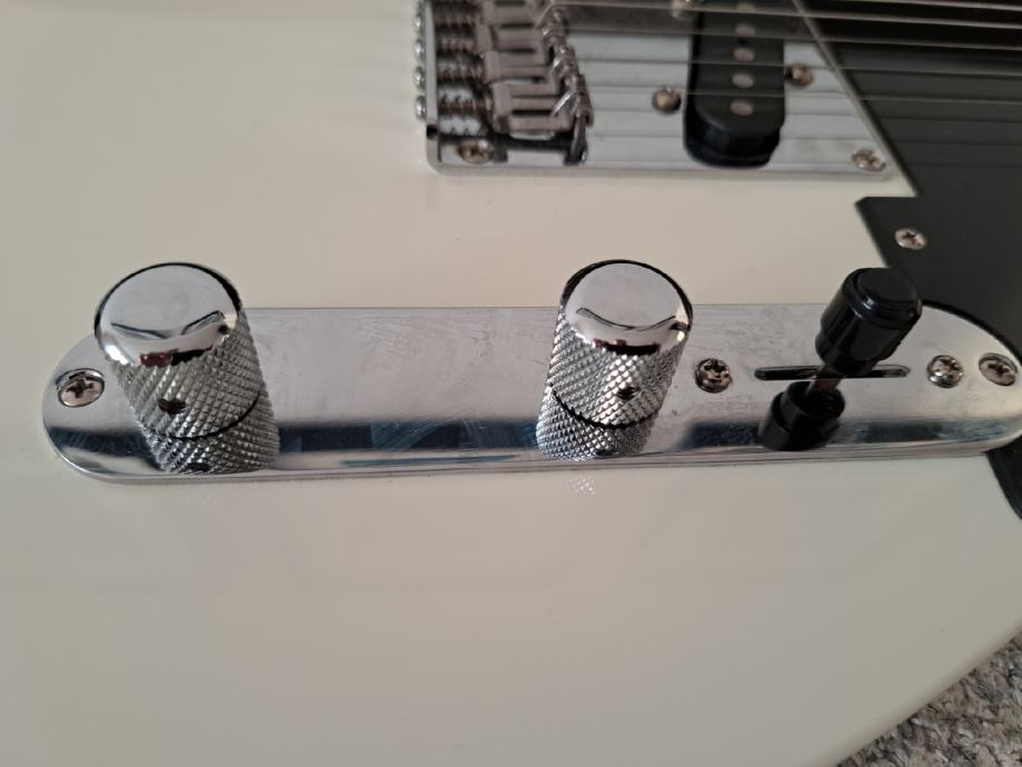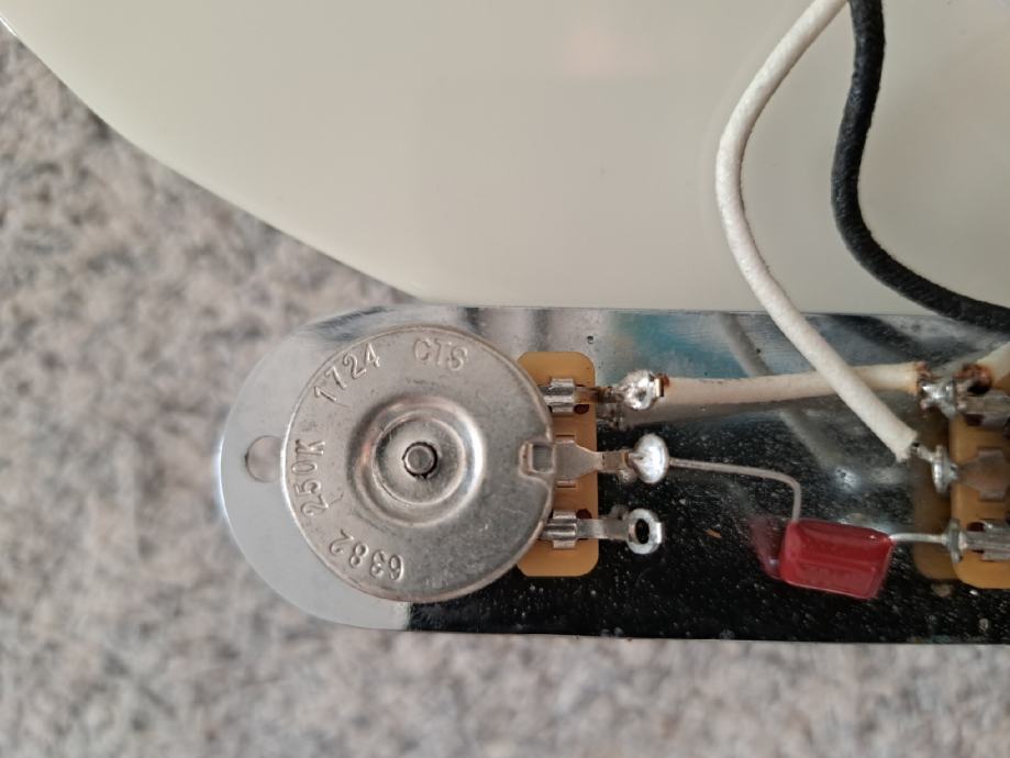 Mini size volume i tone potenciometri su zamjenjeni sa solid shaft 250K CTS potenciometrima, (radjeno sa Vintage braided cloth guitar wire). I stavljeni su Pure Vintage 52 Telecaster Knobs.