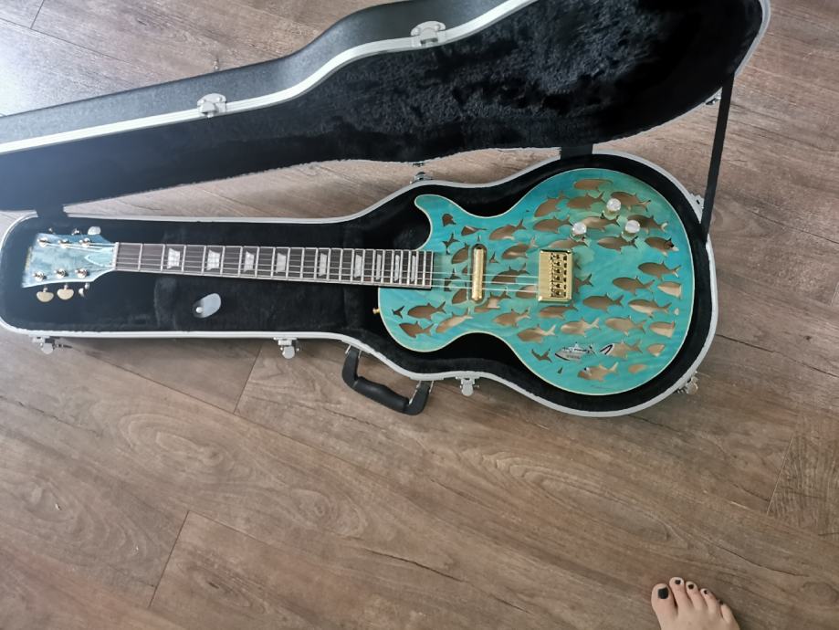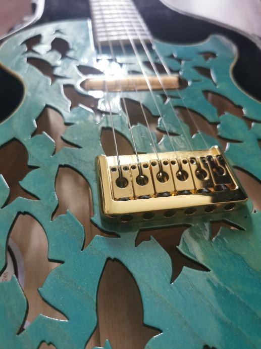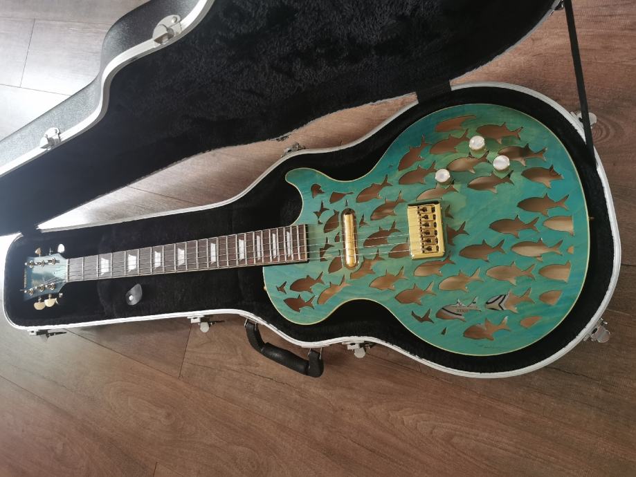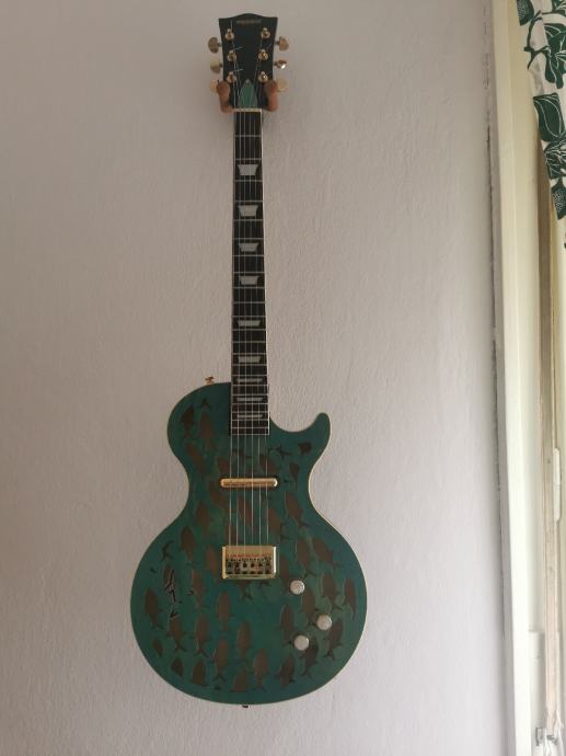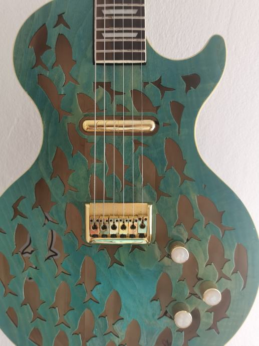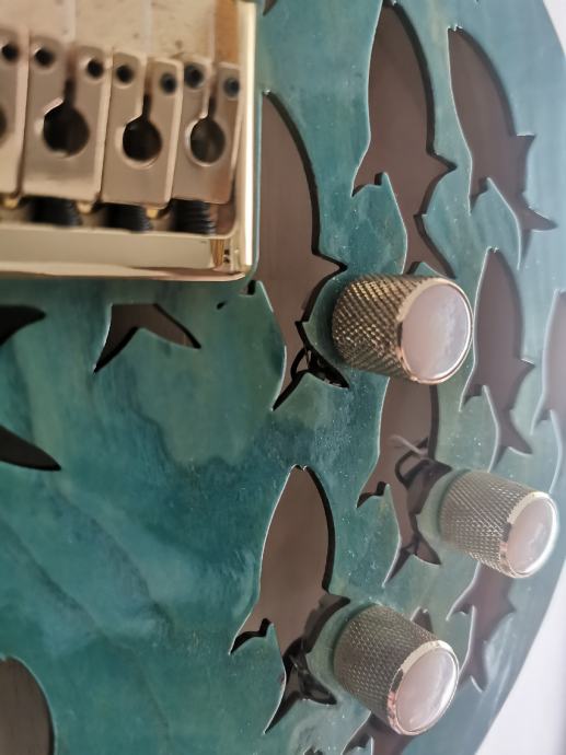 prodajem električnu gitaru sa koferom. Prelijepa,ručni rad. Na prednjoj ploči izrezbareni oblici u obliku riba.