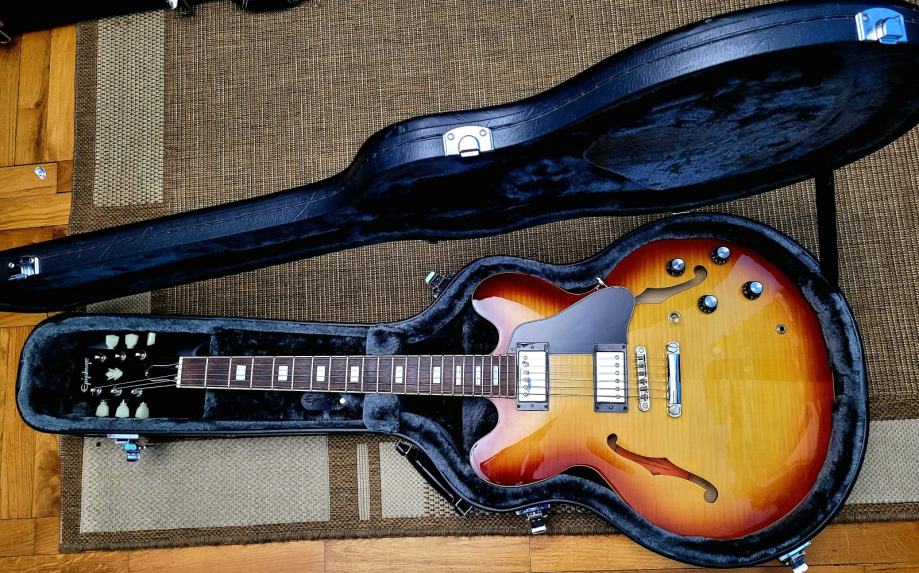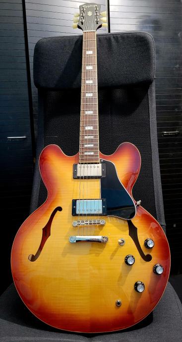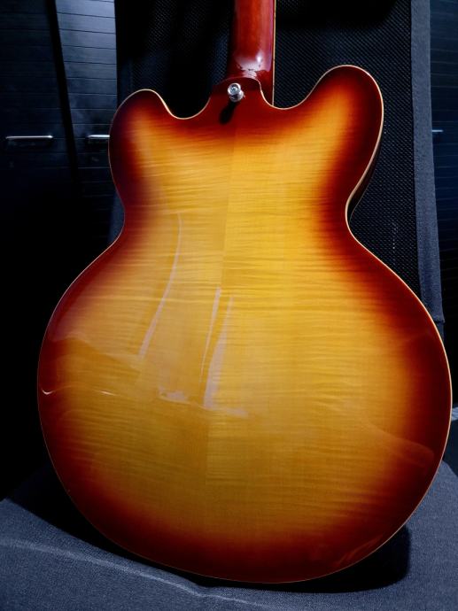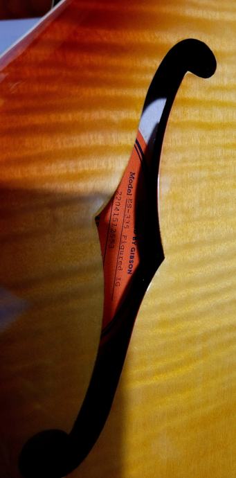 Za ES335 vrlo lagana (3.4kg) i rezonatna. Pragovi su na nekih 95%, još dugo mogu poslužiti. Nedavno stavljene nove žice i napravljen setup.