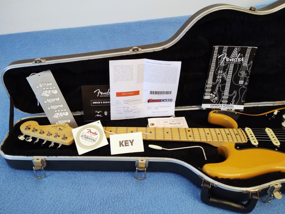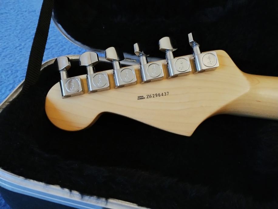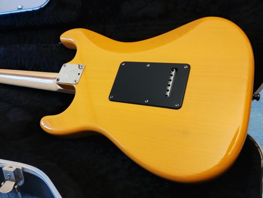 Fender American Standard Stratocaster, butterscotch blonde finish, stavljeni crni strap lockovi. Vizualno ima malih tragova korištenja, ali sve radi kako treba. Dolazi s kompletnim case candyjem i original Fender koferom s ključevima.