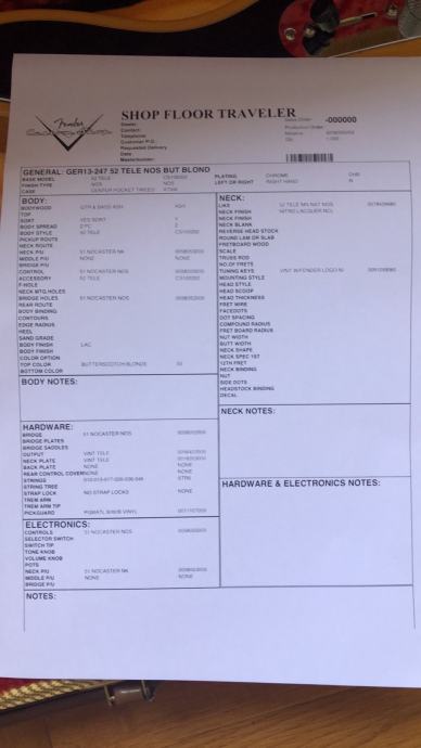Shop floor traveler dokazuje da se od pocetka pazilo na sve, lagana, PU su CS 51 Nocaster, te troslojni pickguard.