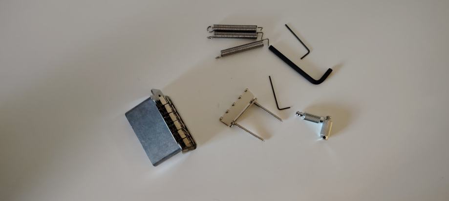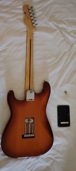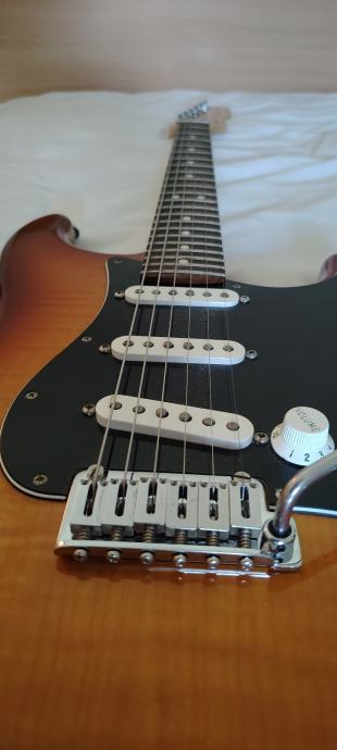 Gitara je očuvana, stara 2 godine, radi odlično, na nju je stavljen novi Gotoh 510TS-FE1 tremolo koji radi dosta dobro. Gitara na headstocku ima manjih tragova korištenja, vidi se na 4. slici. Uz nju dajem i stari tremolo i ručicu i potrebne alate za njih.