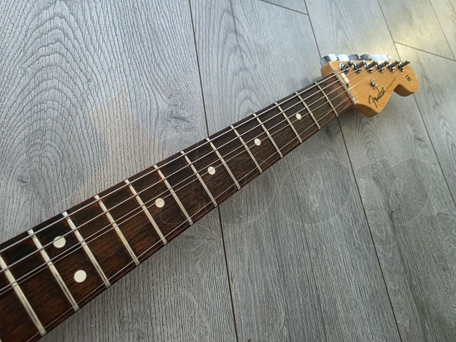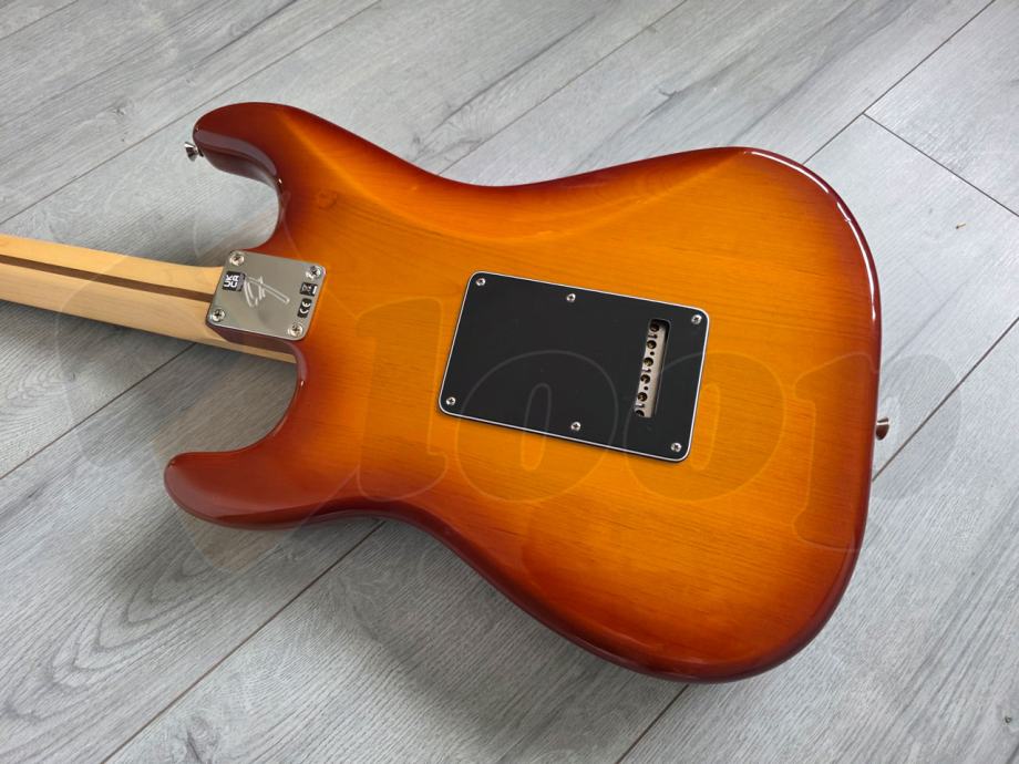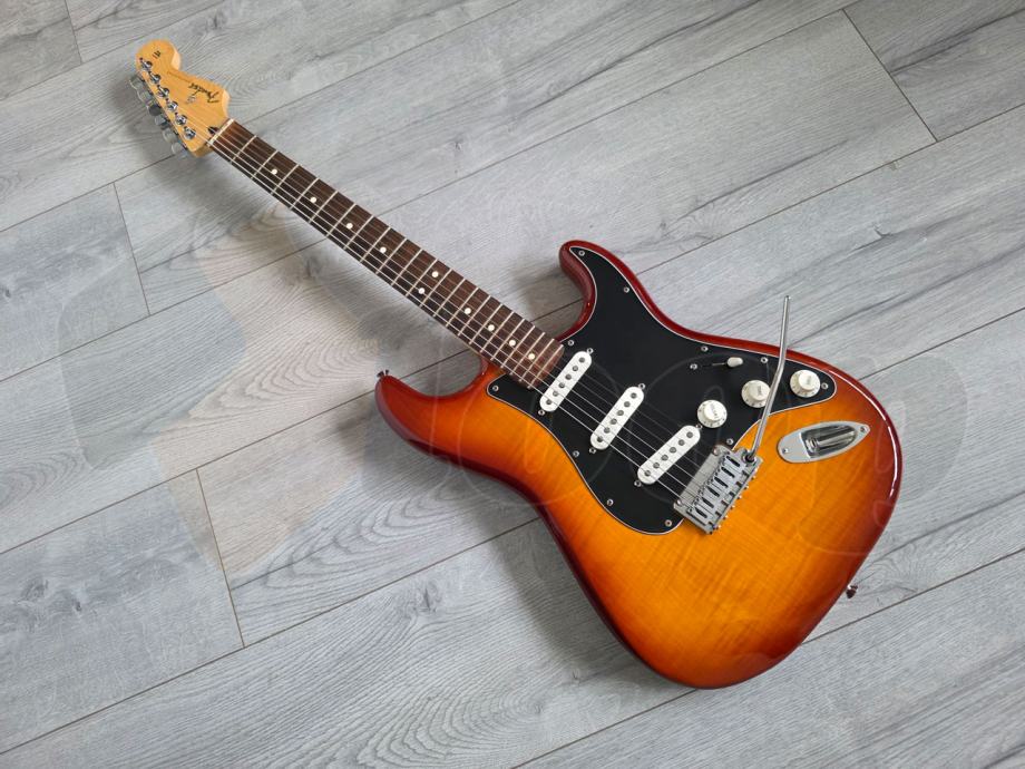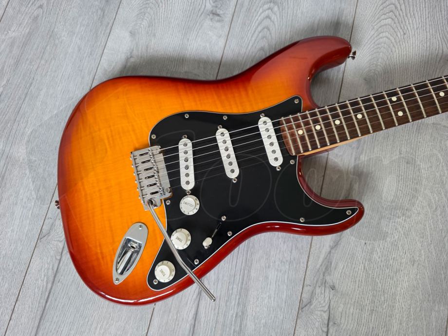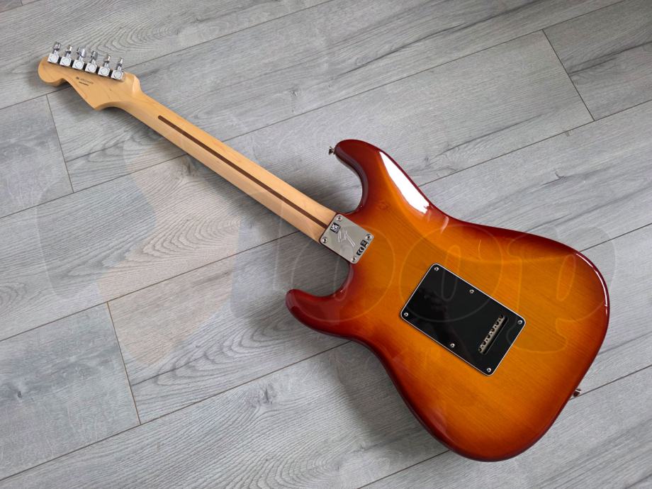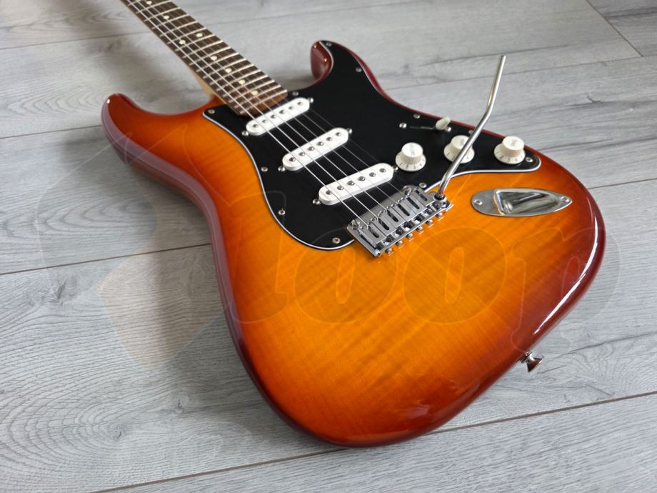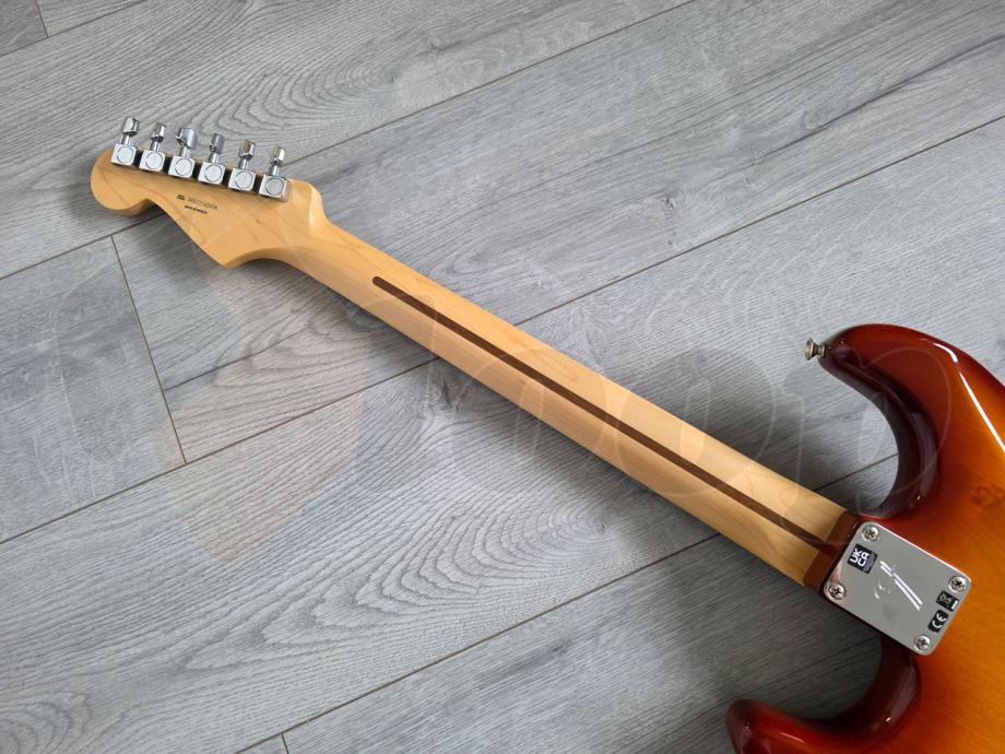 iznimno očuvana električna gitara Fender Player Strat Plus Top, Pau Ferro Fingerboard, Tobacco Sunburst. Made in Mexico, 2022. godine.