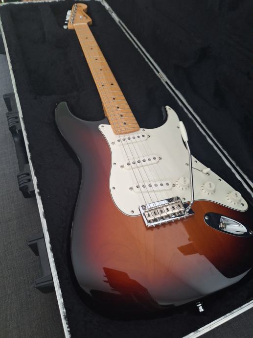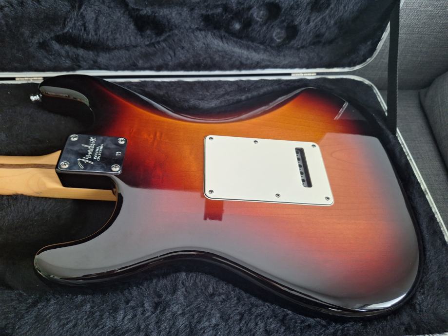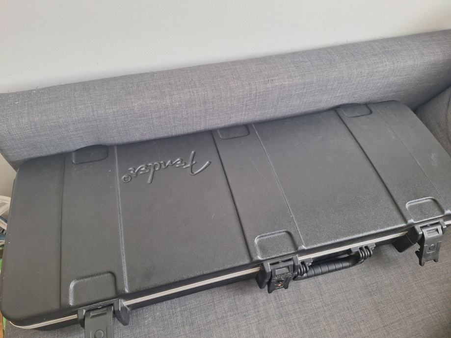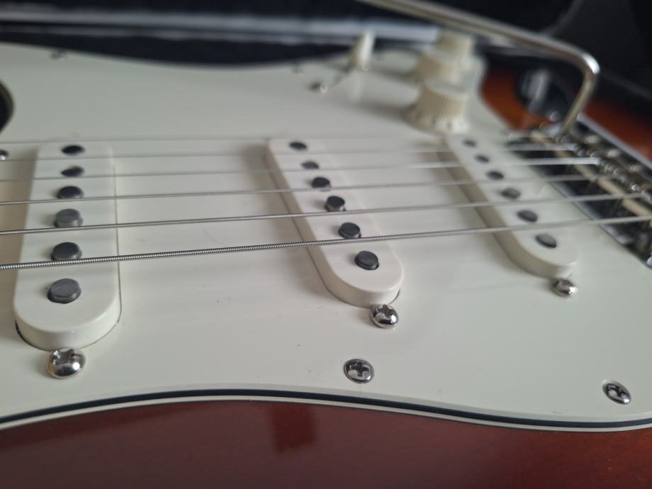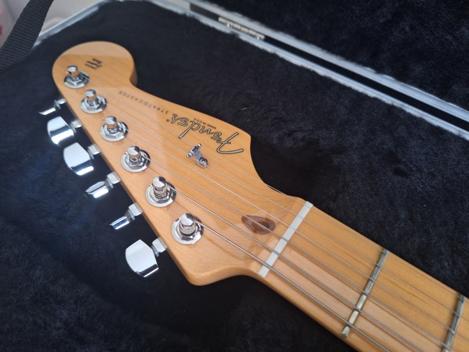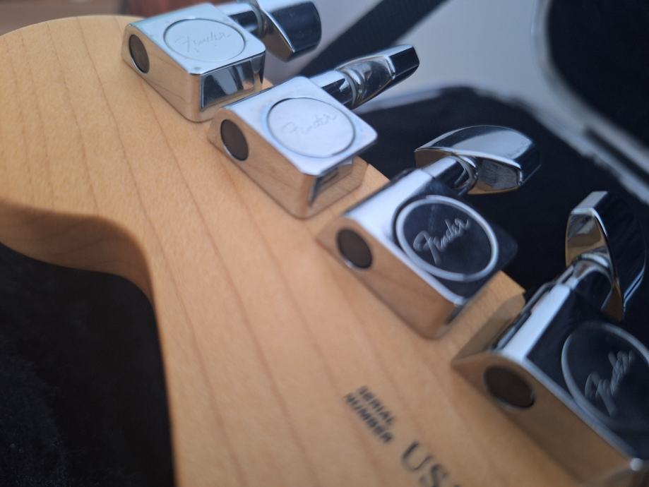 Dobro očuvana električna gitara, nema oštećenja na laku - na slikama su samo odrazi od svjetla. Ovo je jedna od najboljih i najkvalitetnijih serija koje je pravio Fender: Made in USA 2010, Solid body Alder, 3 Alnico V Single coil Strat pickupa, Maple neck Modern C shape, skala 25.5″, 9.5″ radius, 2 point Synchronized Tremolo, chrome hardware, 3.6 kg. Na gitari sve original, svirana isključivo u kućnim uvjetima. Tremolo ručica ide uz gitaru. I naravno Fender kofer. Gitara zvući fenomenalno i mekana za sviranje.