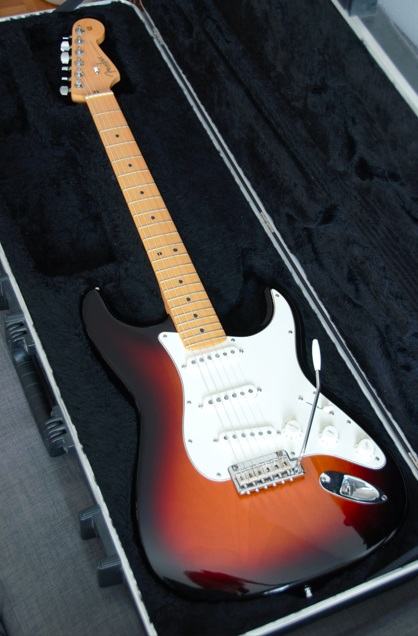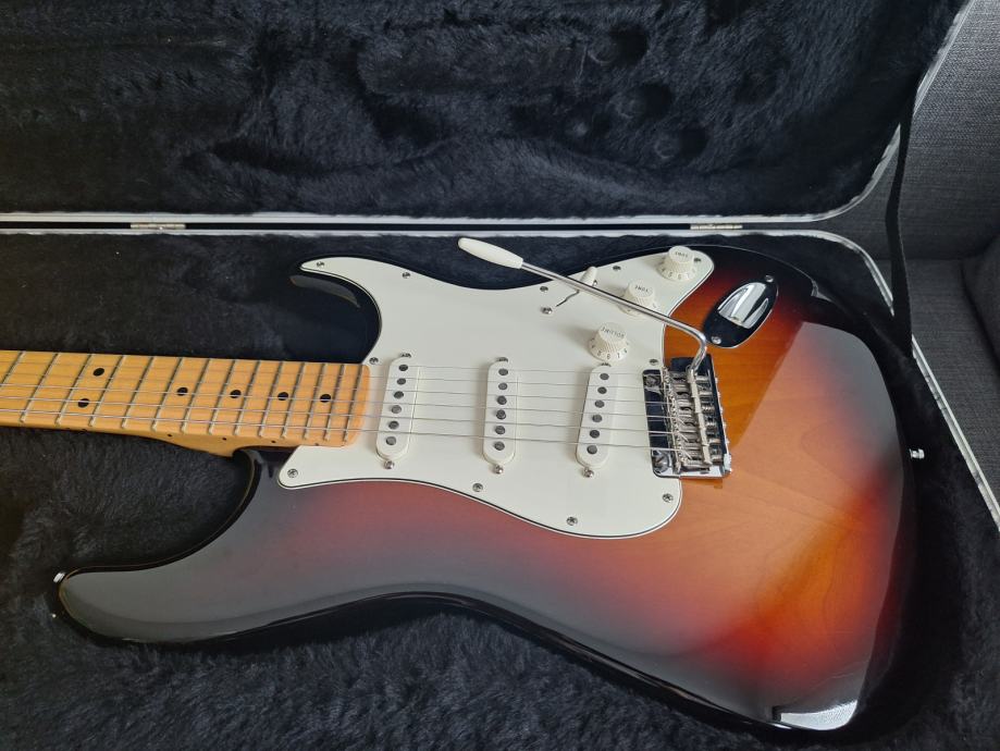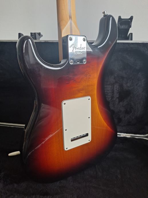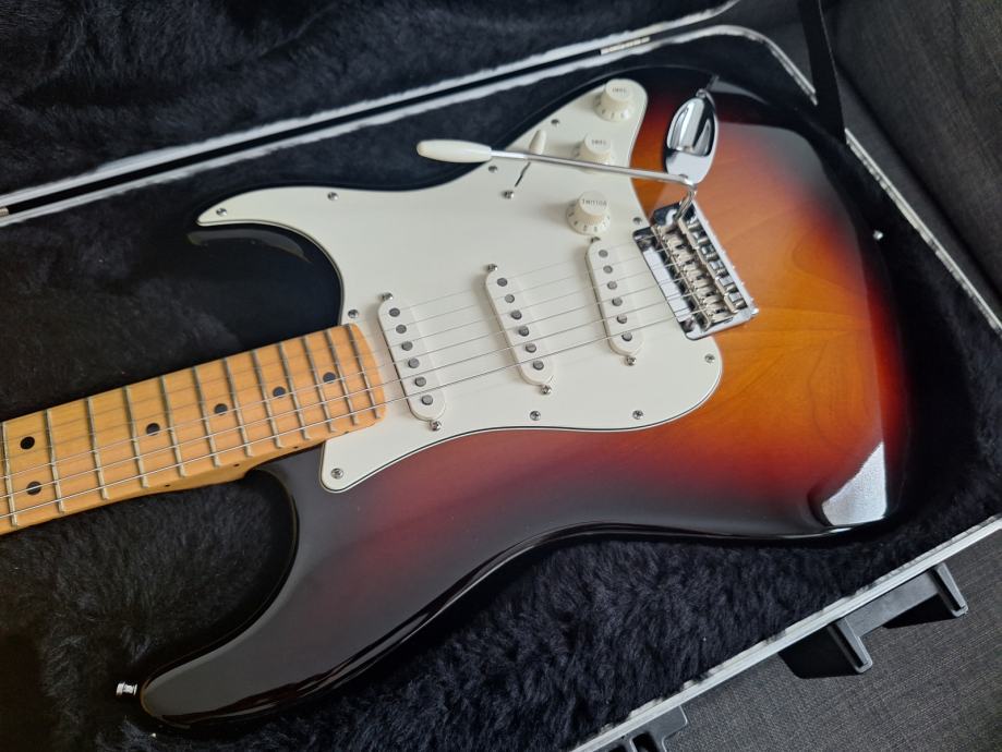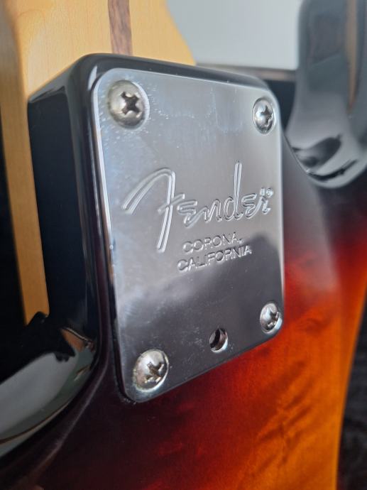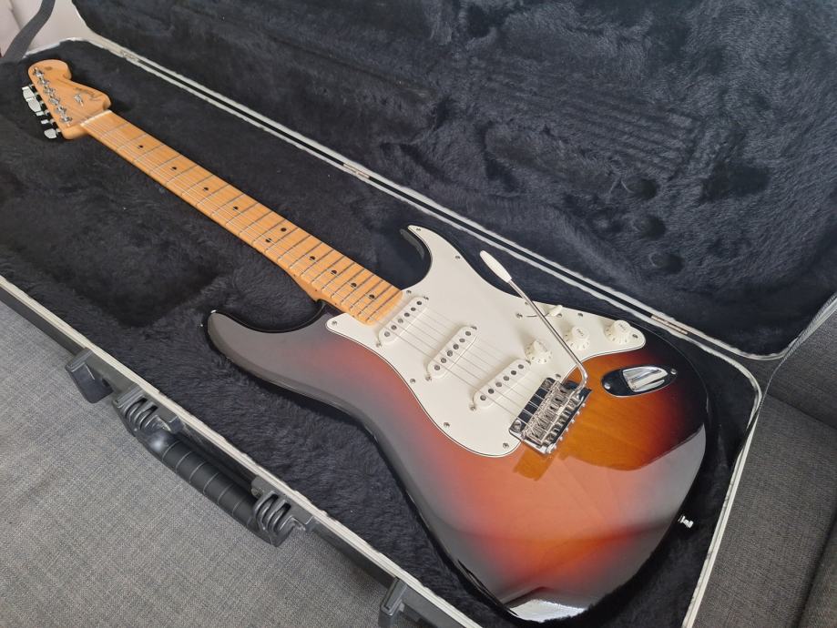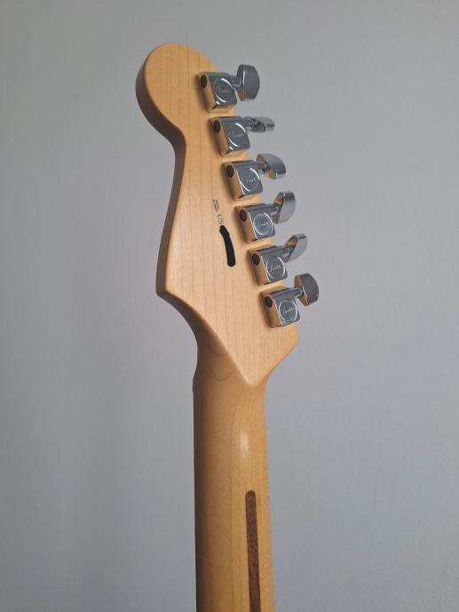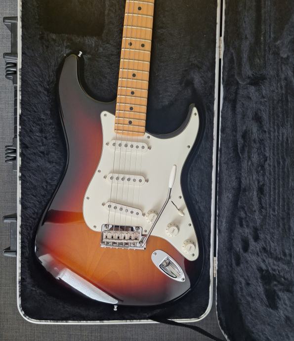 Dobro očuvana električna gitara, nema oštećenja na laku - na slikama su samo odrazi od svjetla. Ovo je jedna od najboljih i najkvalitetnijih serija koje je pravio Fender: Made in USA 2010, Solid body Alder, 3 Alnico V Single coil Strat pickupa, Maple neck Modern C shape, skala 25.5″, 9.5″ radius, 2 point Synchronized Tremolo, chrome hardware, 3.6 kg. Na gitari sve original, svirana isključivo u kućnim uvjetima. Tremolo ručica ide uz gitaru. I naravno Fender kofer. Gitara zvući fenomenalno i mekana za sviranje.